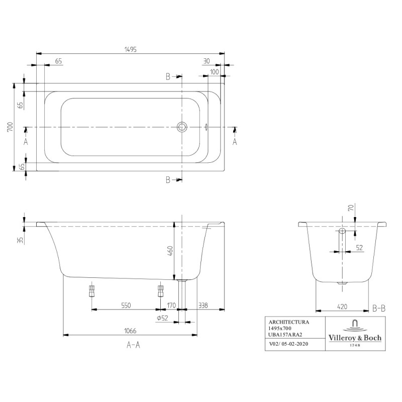 Dimensions de la Baignoire droite 150 X 70 VILLEROY ET BOCH Architectura acrylique avec pieds