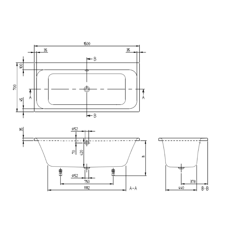 Caractéristiques techniques de la Baignoire droite 150 x 70 VILLEROY & BOCH Architectura