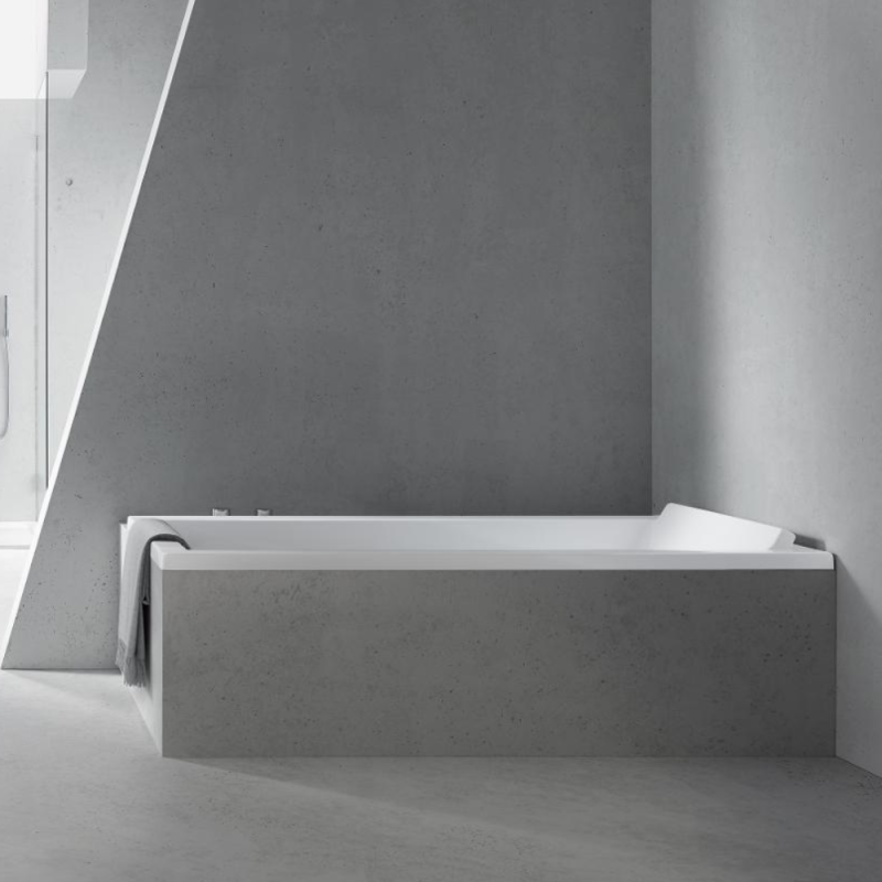 La baignoire peut être carrelée en version encastrée ou combinée avec un habillage de baignoire assorti en acrylique blanc