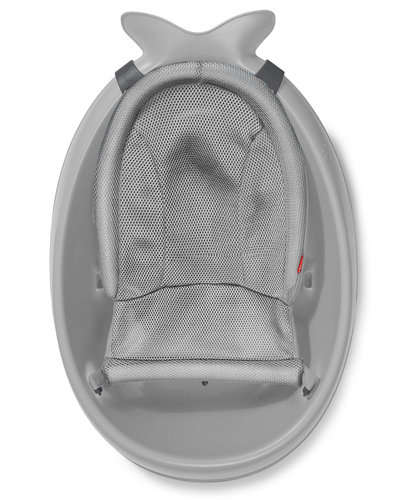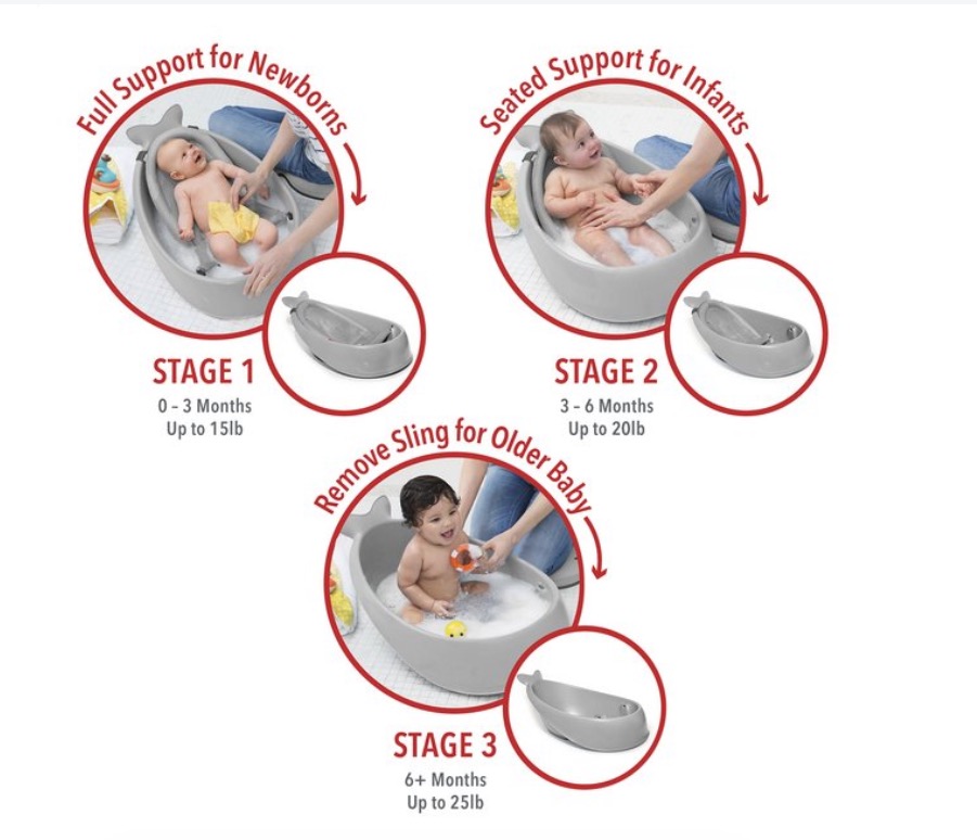 Cette large baignoire de SkipHop grandit en 3 étapes avec votre bébé. Pas besoin d'en acheter d'autres: pratique!