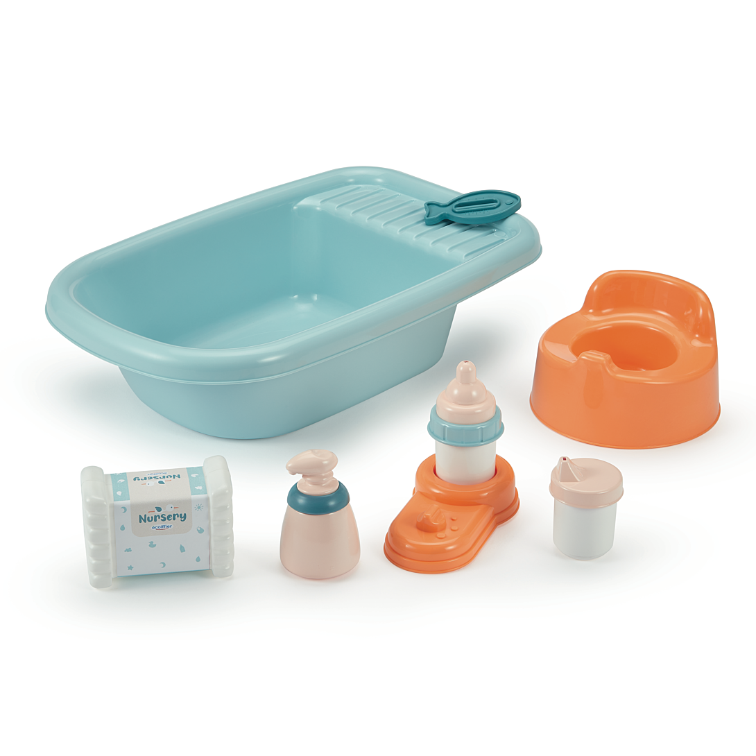 | La boîte contient | Une jolie baignoire pour donner le bain à bébé ainsi que de nombreux accessoires: pousse-pousse, couche, thermomètre, pot, biberon et chauffe biberon. Conseillé dès 18 mois. Origine France Garantie. |