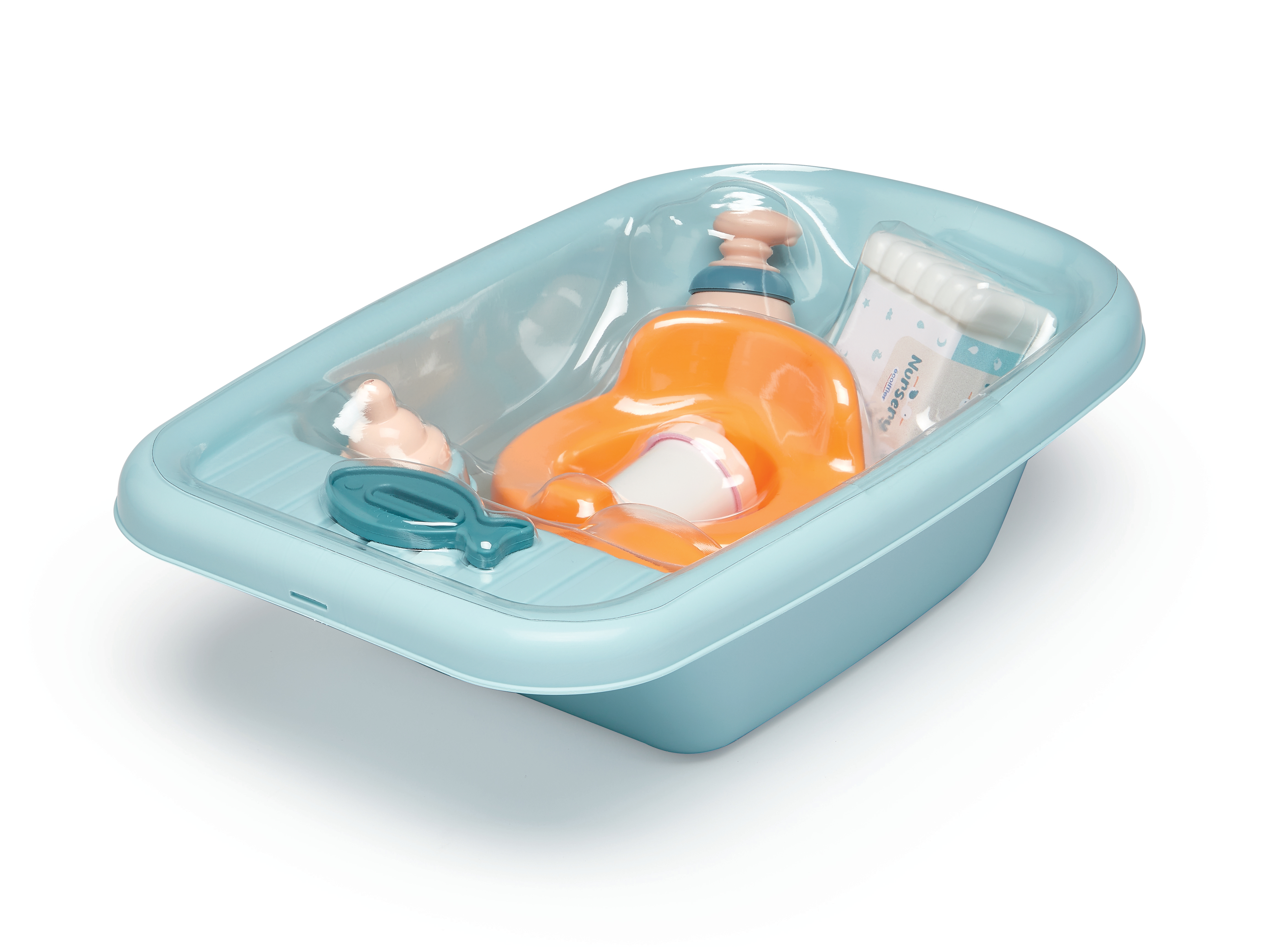 Une jolie baignoire pour donner le bain à bébé ainsi que de nombreux accessoires: pousse-pousse, couche, thermomètre, pot, biberon et chauffe biberon. Conseillé dès 18 mois. Origine France Garantie.