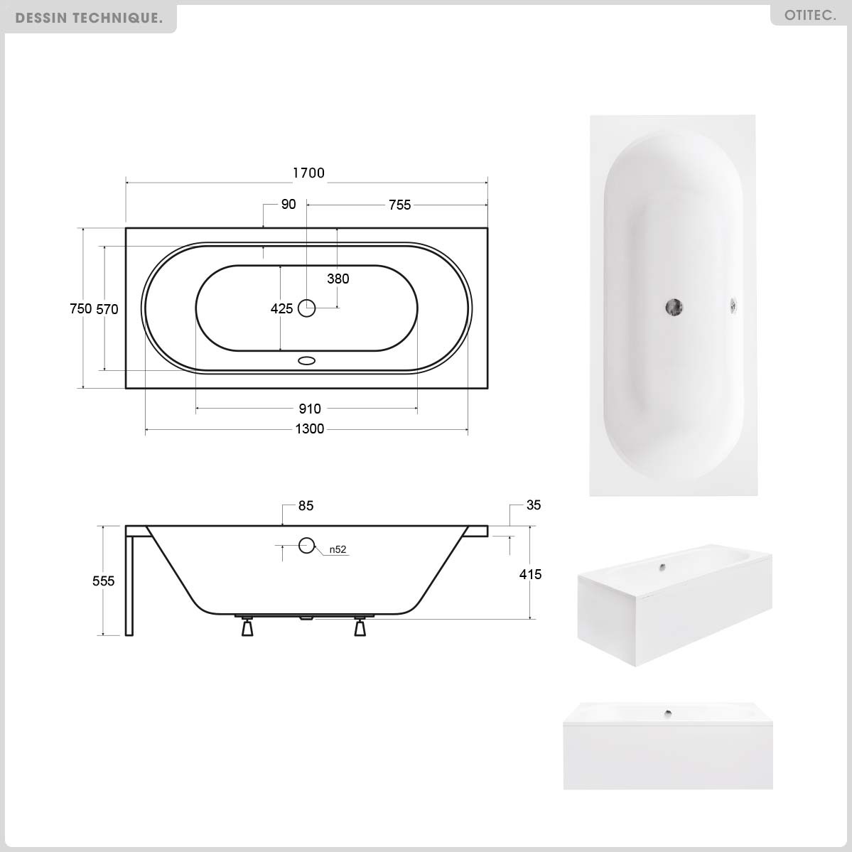 | Libellé | Baignoire rectangulaire - 170 x 75 cm - sans Habillage - avec Pieds - Vidage Chrome - VITAE |
