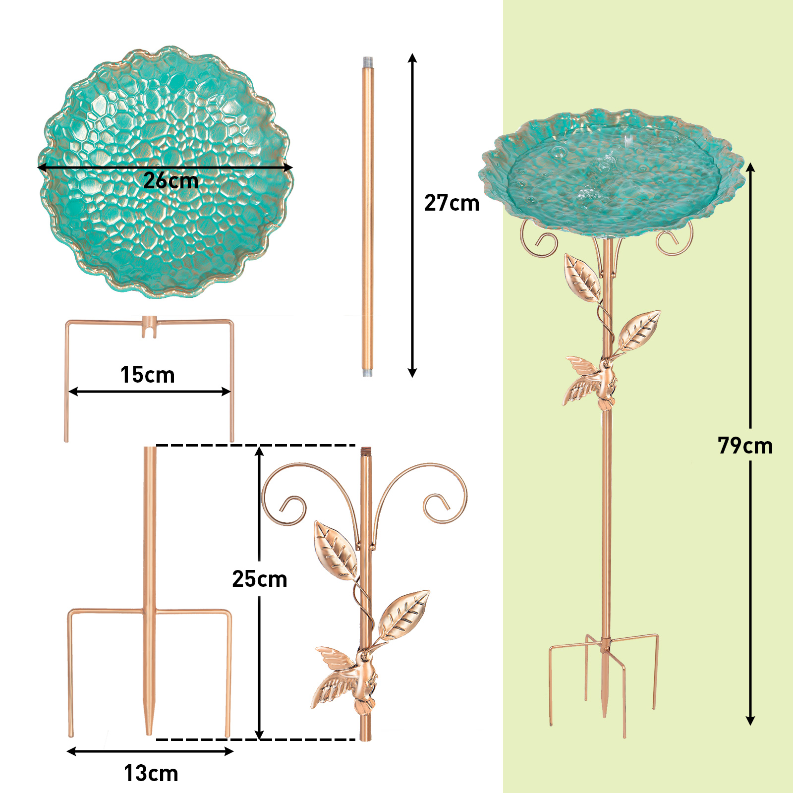 Base stable à 5 dents : La base robuste à 5 fourches offre une stabilité supérieure, garantissant que le bain d'oiseaux reste droit et fermement en place dans votre jardin. Le piquet en métal et la finition enduite de poudre empêchent toute flexion, rupture ou cassure.