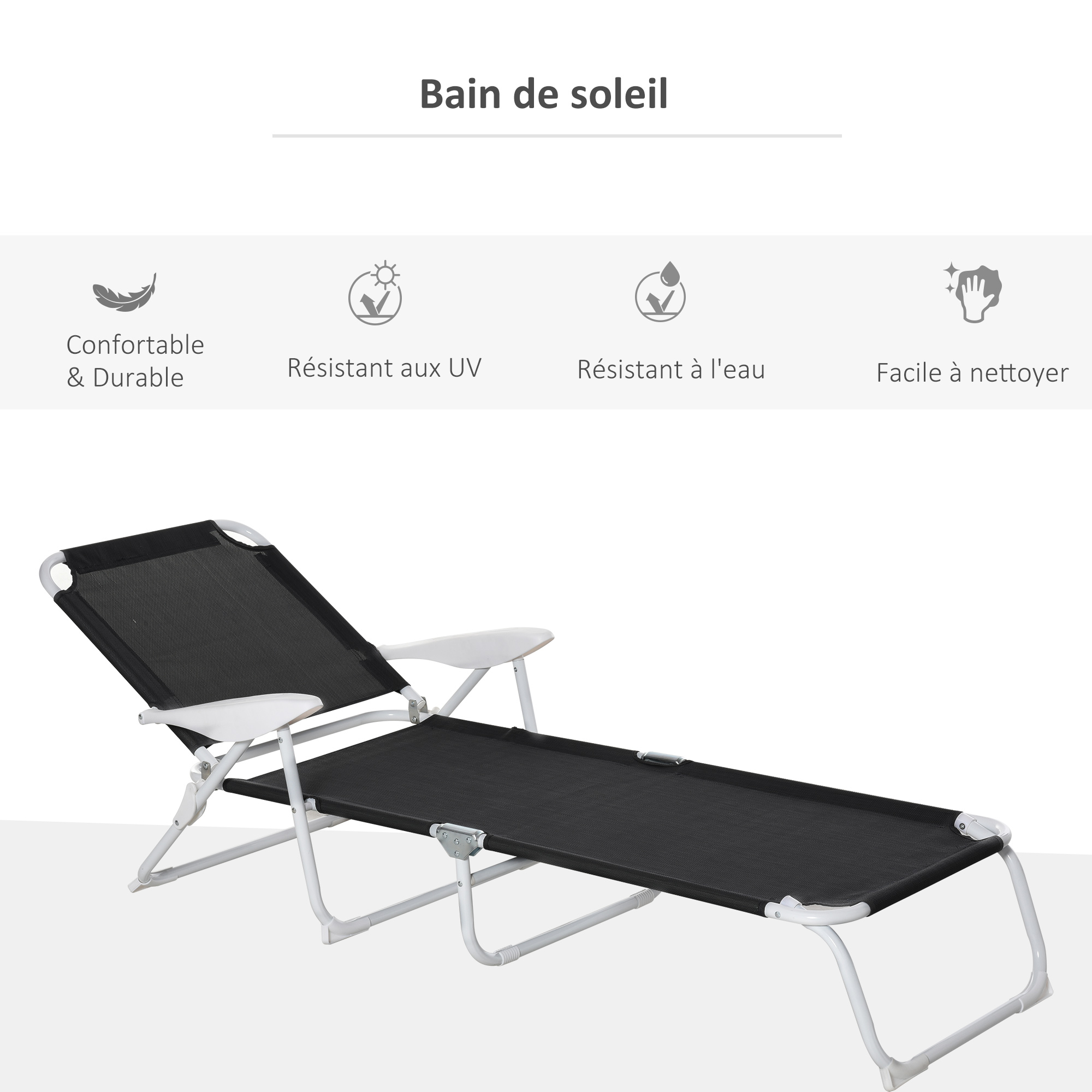 | Libellé | Bain de soleil pliable - transat inclinable 4 positions - chaise longue grand confort avec accoudoirs - métal époxy textilène |