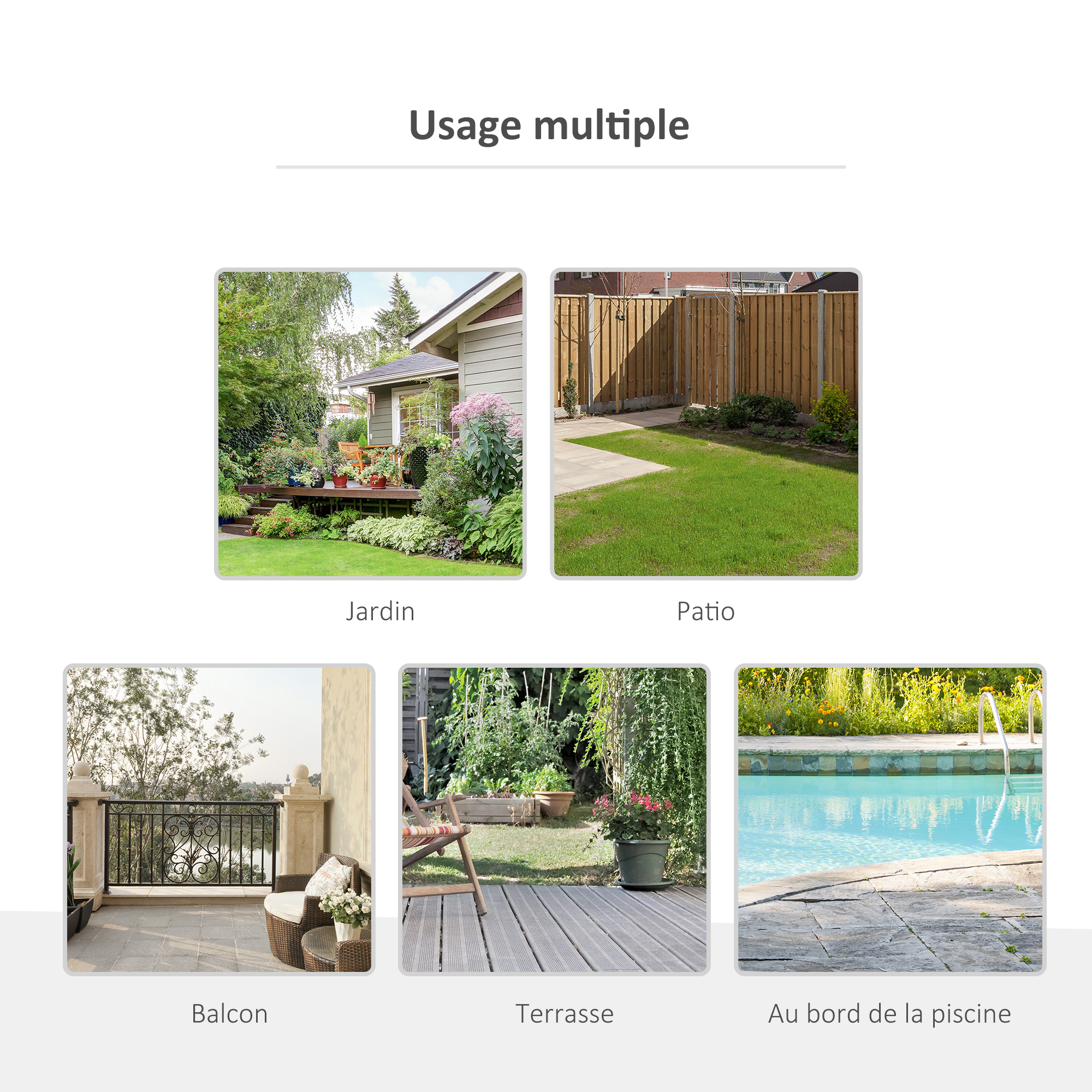 - Convient autant à un usage extérieur (jardin, piscine, camping, plage) comme intérieur (véranda, patio)