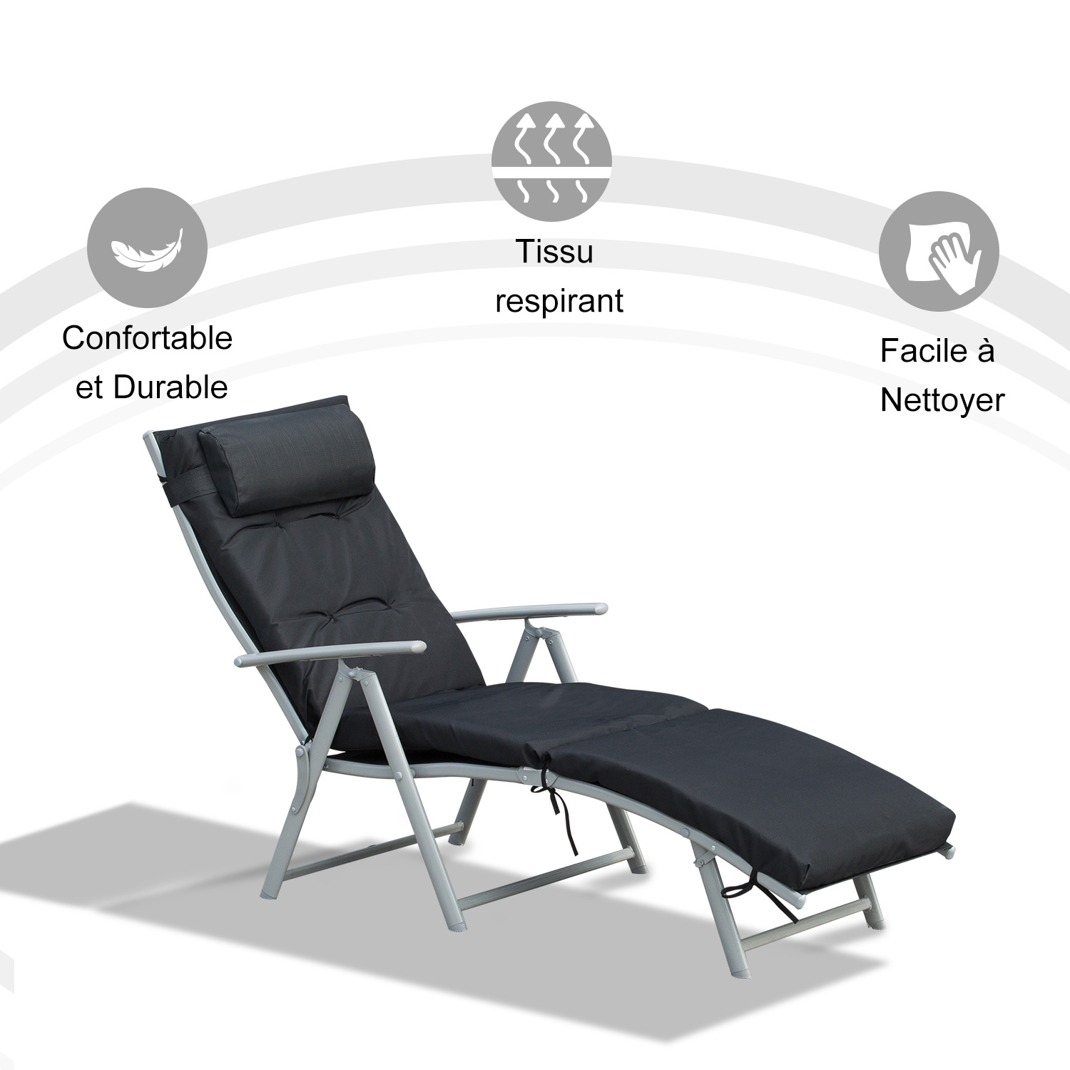 | Libellé | Bain de soleil pliable transat inclinable 7 positions chaise longue grand confort avec matelas + accoudoirs métal époxy textilène polyester noir |