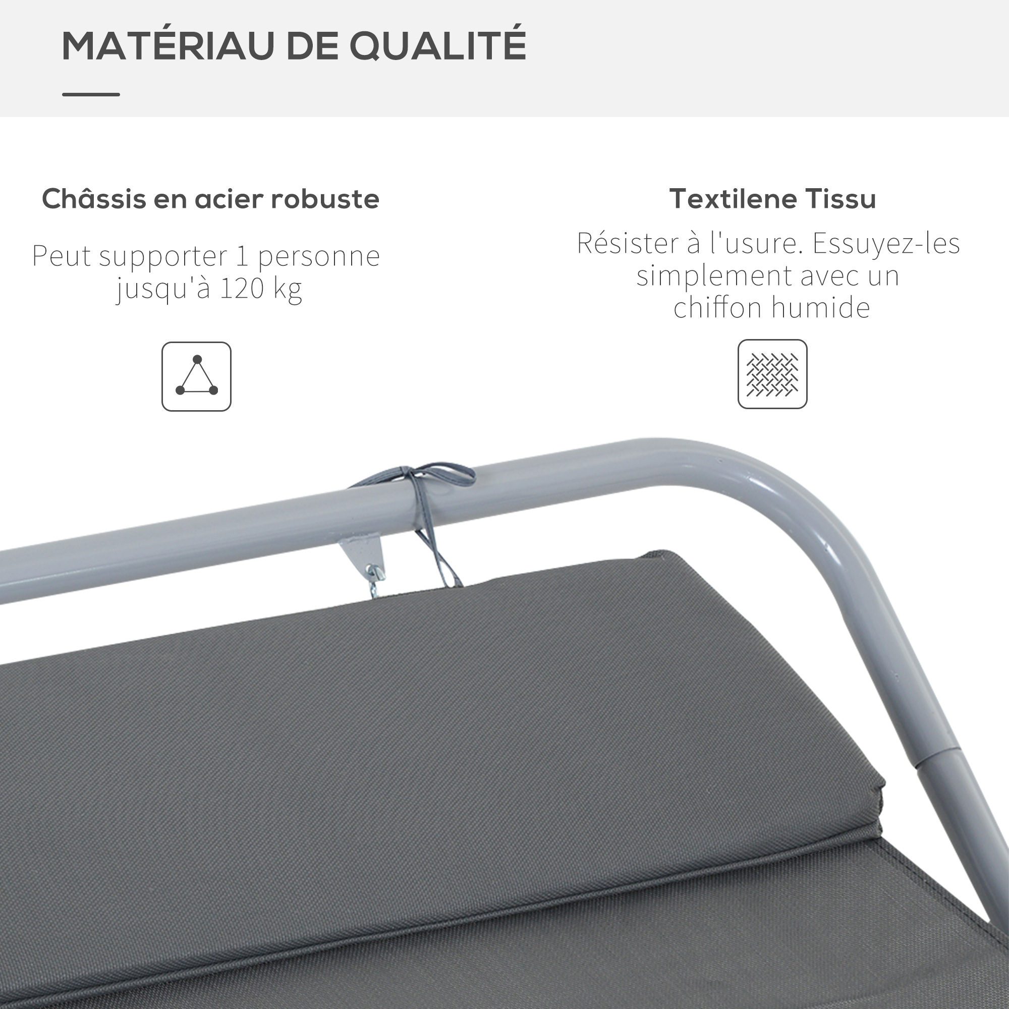 - Lit et tétière en textilène haute densité 580 g/m², respirant et anti-moisissure