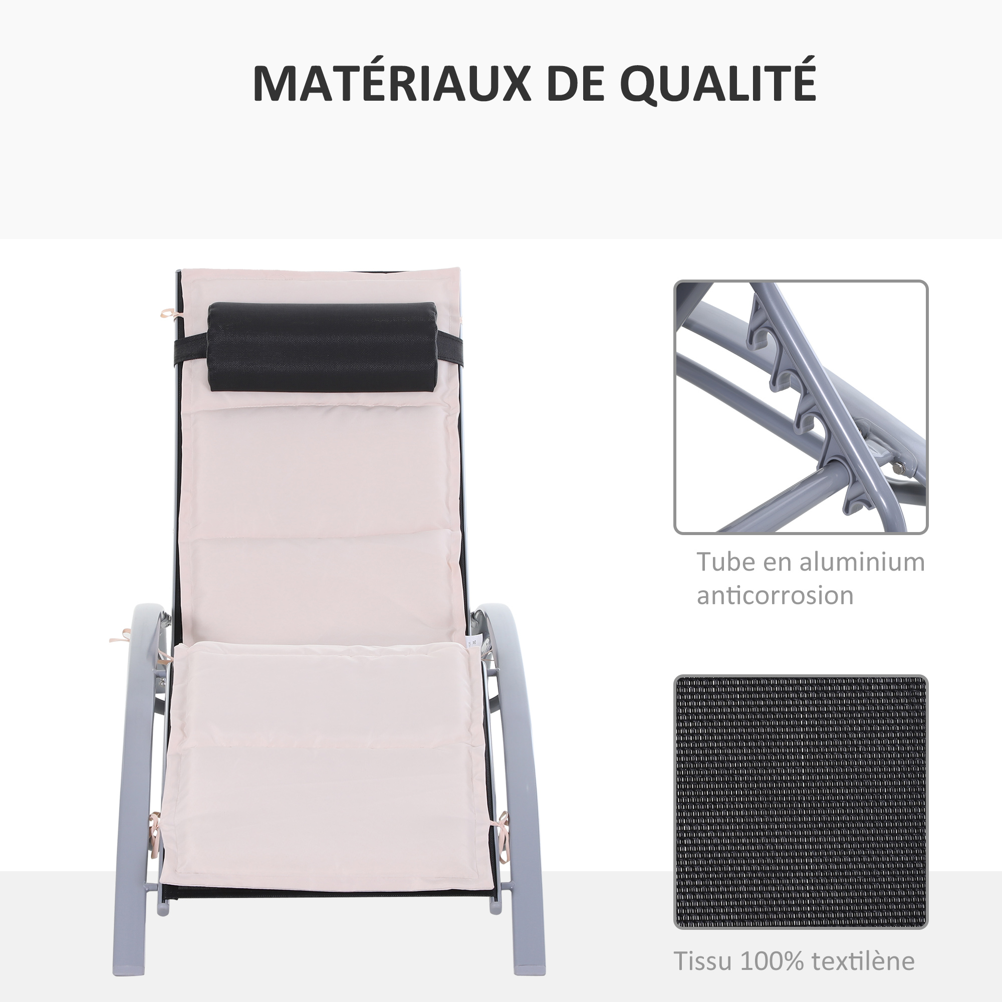 - Matériaux principaux : aluminium, textilène