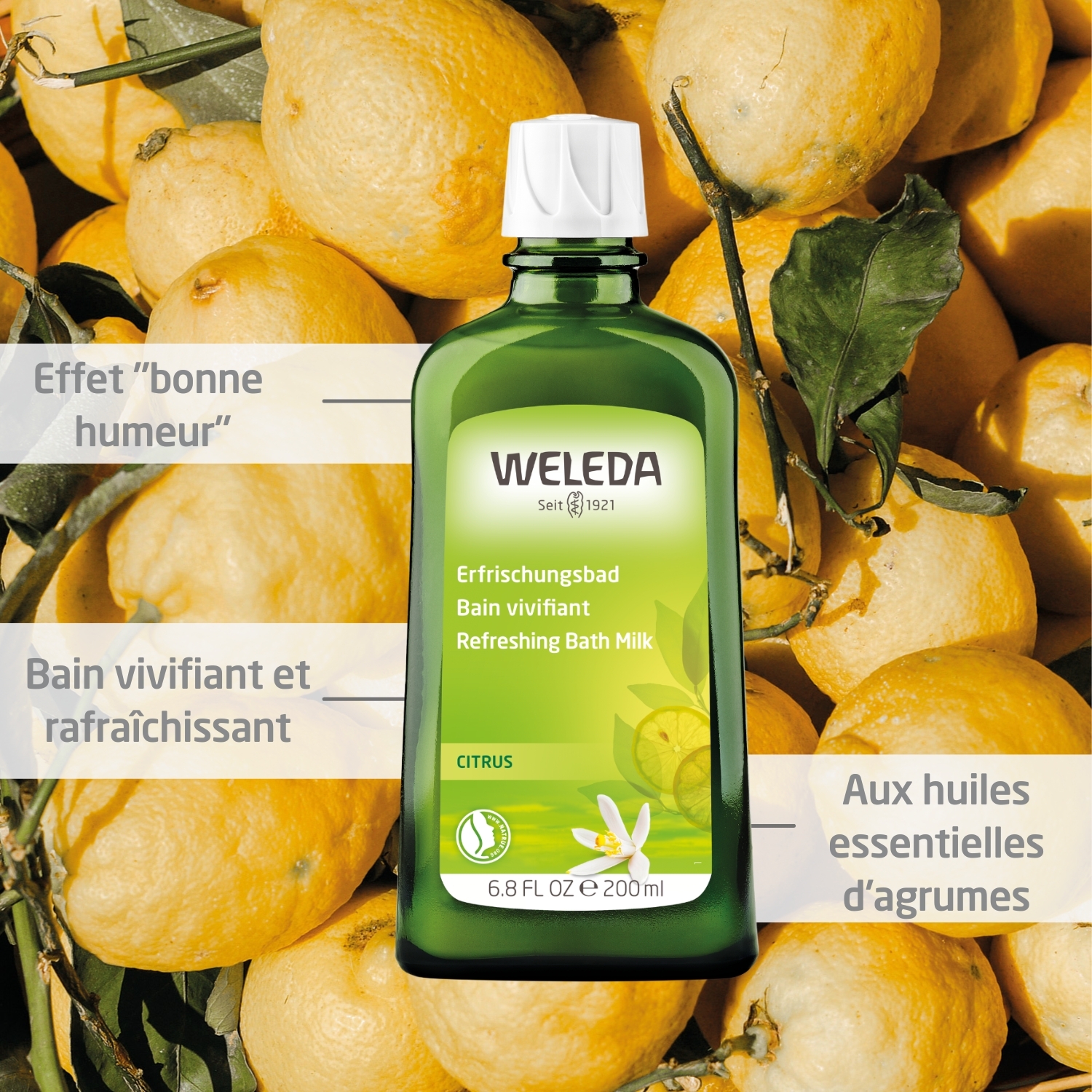 Ce bain aux huiles essentielles d'agrumes (citron et orange), aux fragrances fruitées et estivales, permet de retrouver fraîcheur et tonus après une chaude journée d'été, ou encore pour faire le plein de bonne humeur pendant la saison froide, après une journée pluvieuse et maussade.. Bienfaisant pour le corps et l'esprit, ce bain peut se prendre à tout moment de la journée.