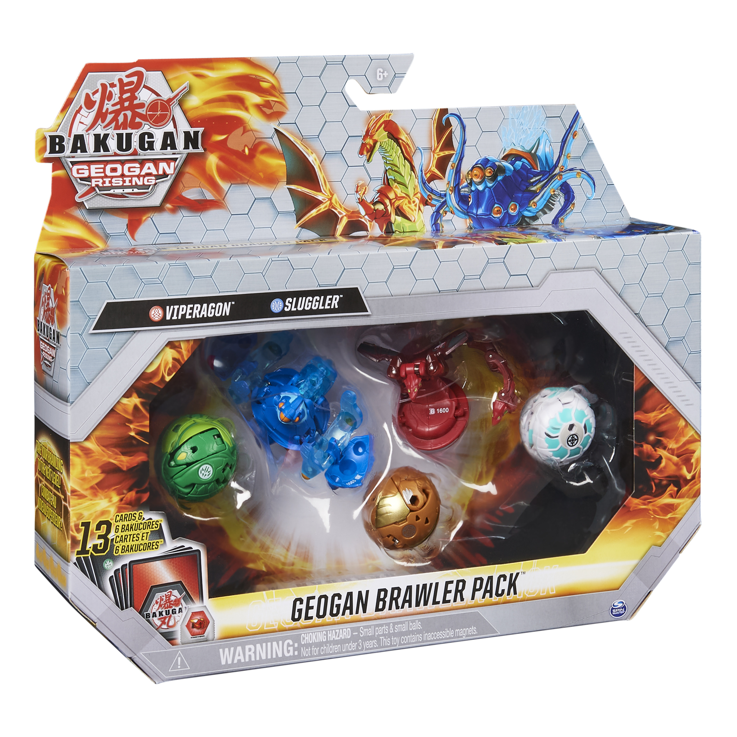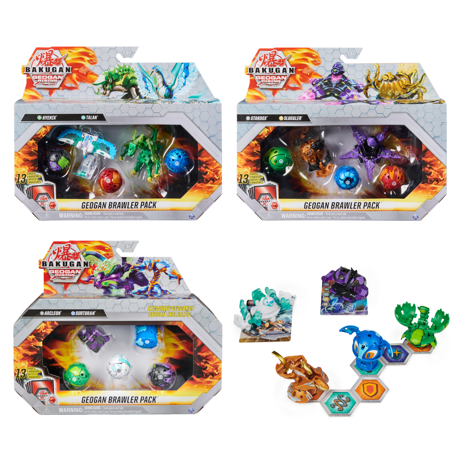 Contenu : 3 Bakugan classiques, 2 Geogan exclusifs, 6 tuiles hexagonales BakuCore, 13 cartes dont 3 métalliques et 1 règle de combat