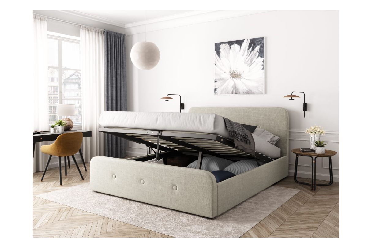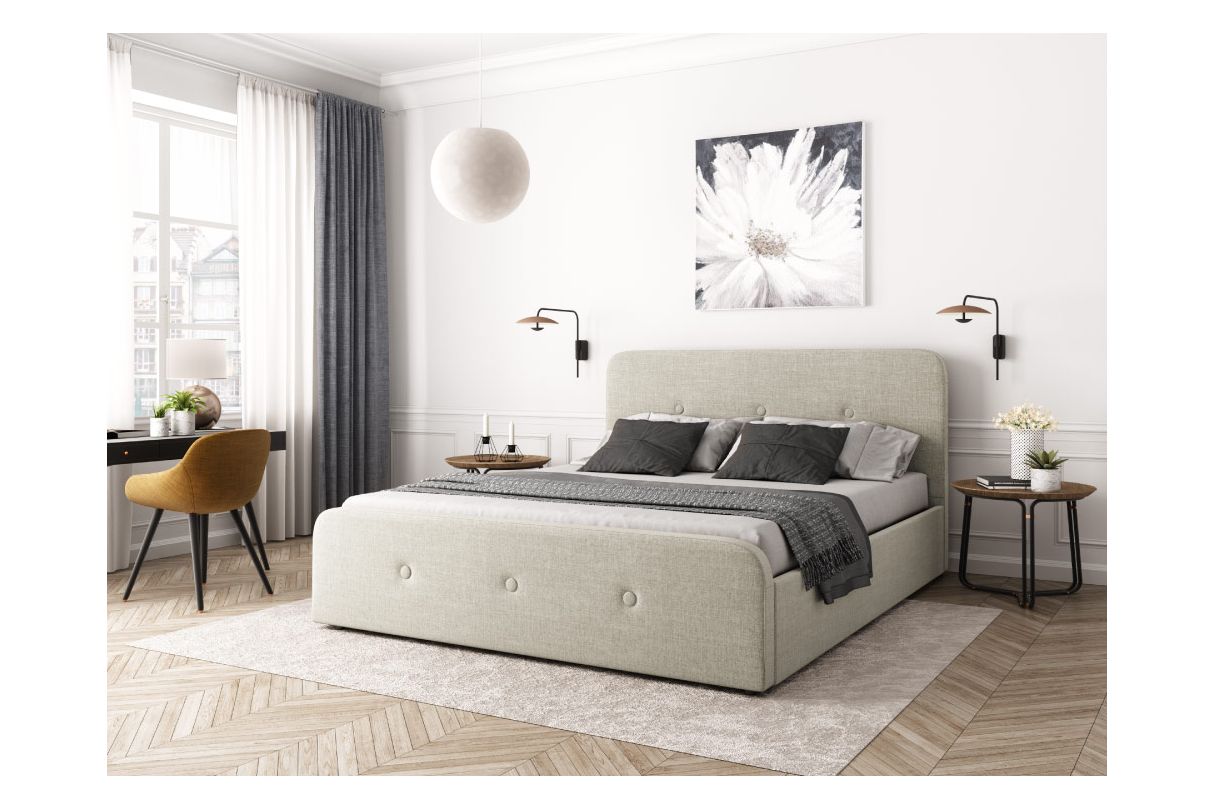 Le cadre de lit est recouvert d'un tissu doux au toucher facile à entretenir. Les couleurs neutres de beige et de gris s'harmonisent parfaitement avec différents styles de décoration.