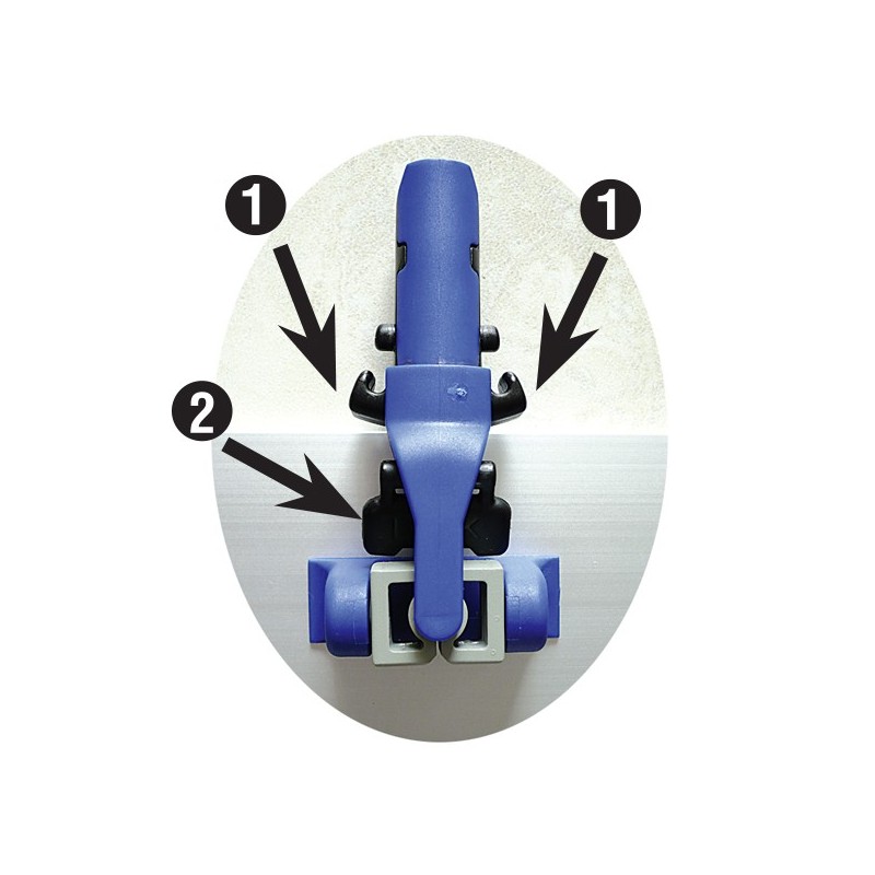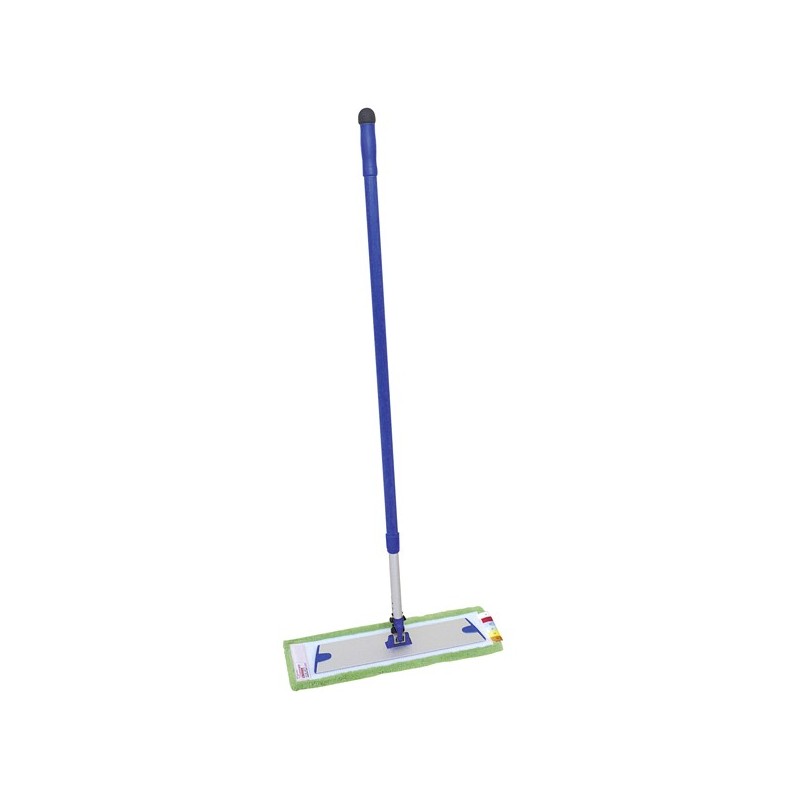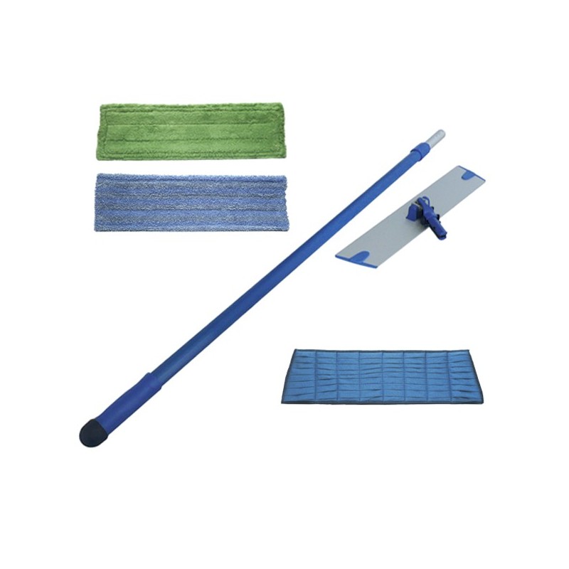 Manche télescopique Poignée antidérapante avec boule Grip, pour ne pas glisser contre le mur Manche 2 sections : 100 à 180 cm. Base articulée A rotation complète, facilite le passage et donne accès à tous les endroits. 2 bandes velcro pour fixer et enlever rapidement les mops. Plateau en aluminium léger 8x40 cm. Mop à usage sec Balayez et ramassez la poussière, les mitons, cheveux et poils d'animaux. Le balai passe partout : sous les lits, les meubles, entre les chaises... Mop à usage humide Carrelages, parquets, murs et plafonds Lavage à l'eau uniquement ou avec un Détergent sols Pour désinfecter, utiliser Microfloor Mop à usage humide renforcé Identique au mop humide mais renforcé avec des bandes de polypropylène Très efficace pour les sols encrassés et difficiles. Dimensions des mops : 14x48 cm. Fonctionnement de l'articulation : - Appuyez sur les 2 ergots pour fixer le manche. - Basculez le "lock" pour bloquer ou débloquer la base.