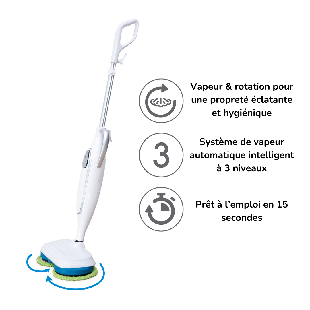 - Nettoyage vapeur puissant et rapide : le balai vapeur rotatif double tête effectue jusqu'à 140 tours par minute pour éliminer efficacement poussière, saletés et taches incrustées sur tous types de surfaces, sans effort ni produit chimique.