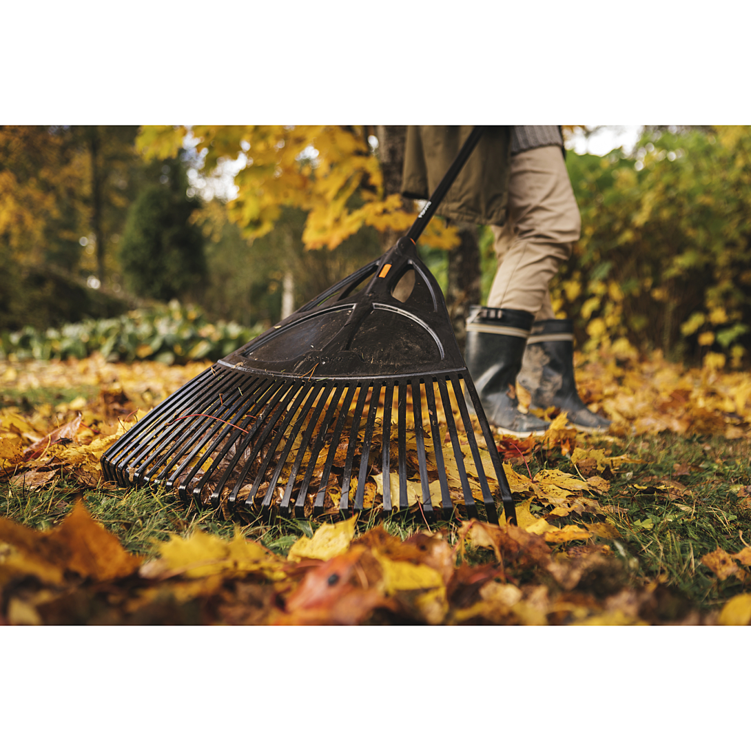 Tête extra large (65cm) qui permet de ratisser rapidement de grandes zones.Balayage plus facile grâce au manche en aluminium plus léger.27 dents plates en plastique rigide: empêche les feuilles de remonter le long des dents.