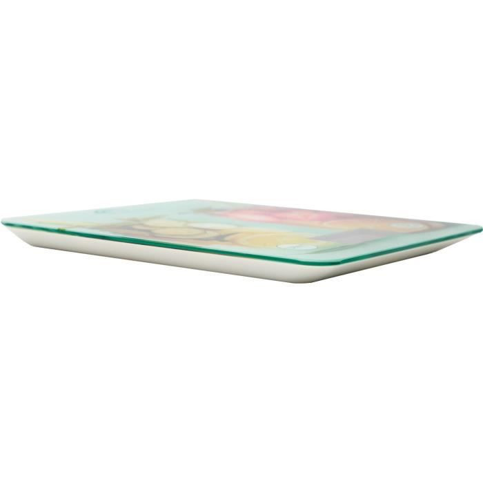 Les balances de la gamme Happy Food offrent une série de 6 designs modernes qui les distinguent de tous les autres produits du marché. Elles disposent d'un équipement qui les positionne au meilleur niveau dans leur catégorie et d'un affichage 2 minutes qui offre un équilibre idéal entre confort d'utilisation et économie des piles. Portée 5 kg - Graduation 1 g - Ecran LCD 61 mm - Dimensions 21.8 x 21.8 cm.