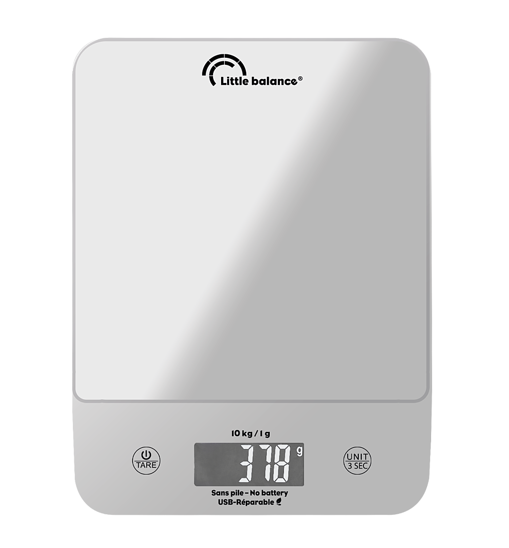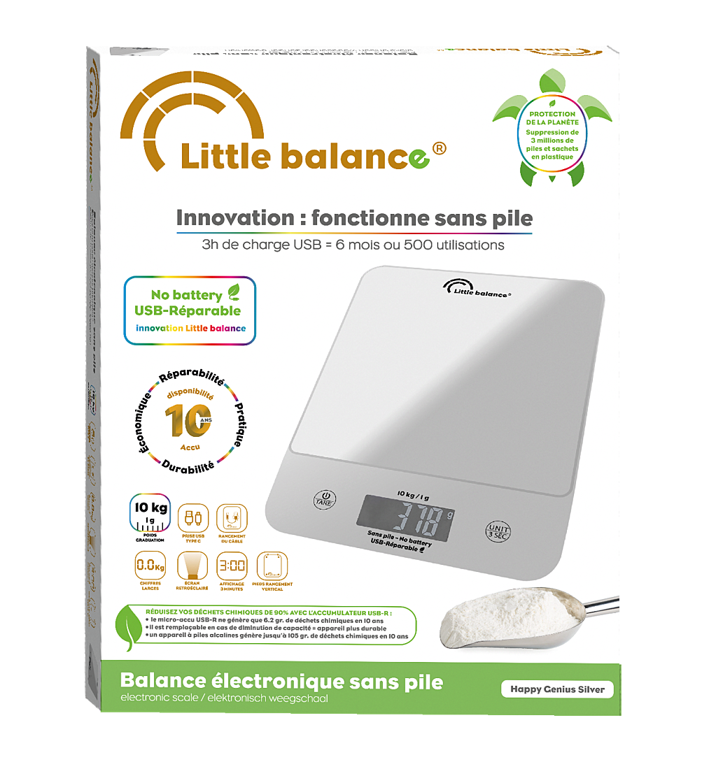 Concentré d'innovation : jusqu'à 10 kilos, sans pile, chargement USB, prise USB-C, pieds de rangement vertical, batterie réparable, rangement du câble, technologie Little Balance, bandeau de commandes incliné, LCD chiffres larges, affichage 3 minutes, écran rétroéclairé