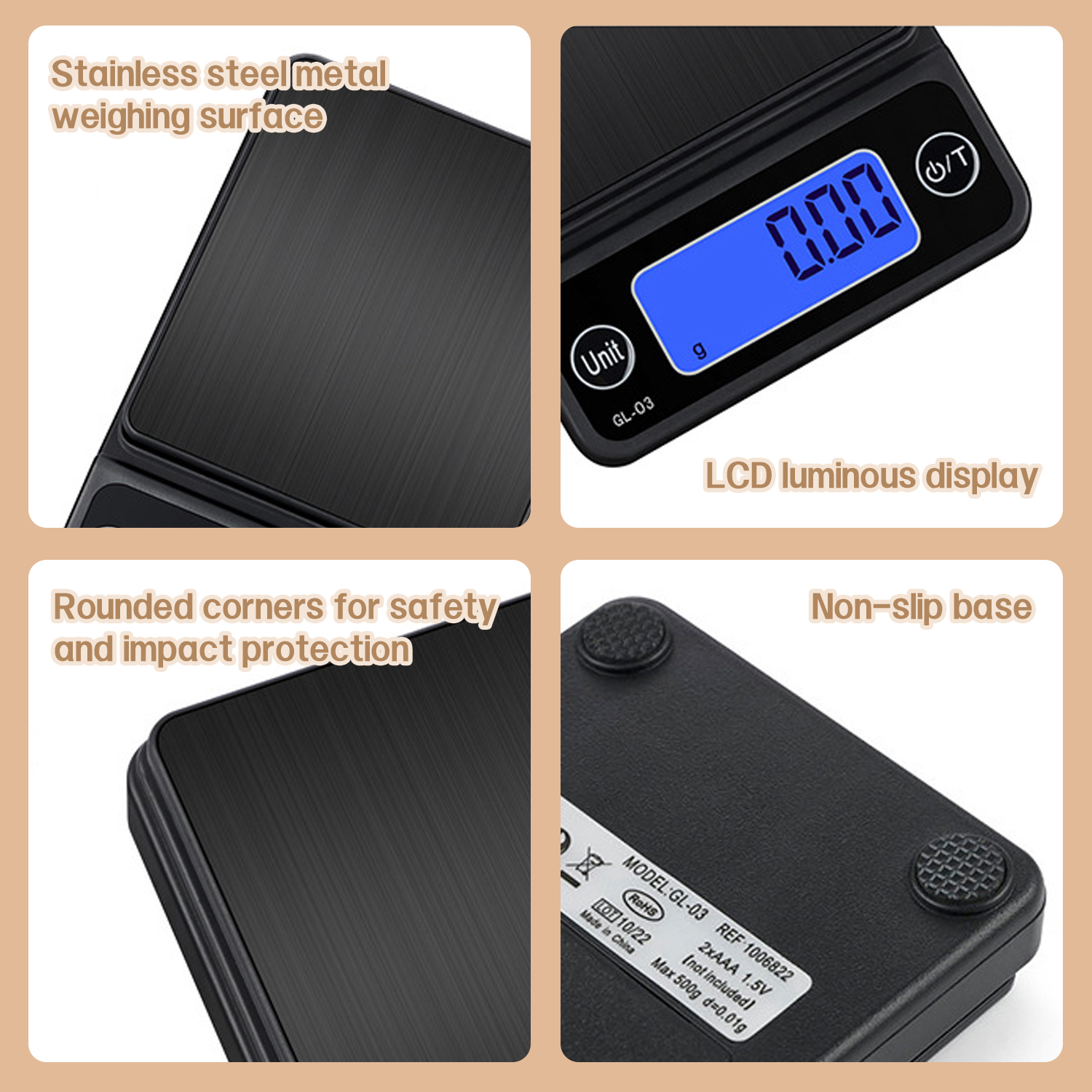 Plateau pratique : Le plateau inclus est doté d'un bord haut, ce qui facilite la pesée des petits objets.