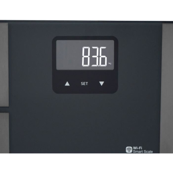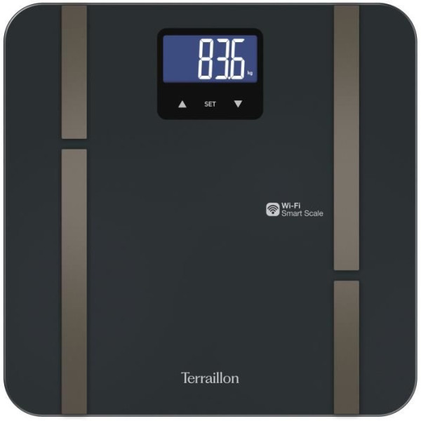 Balance connectée WiFi - impédancemetre :analyse de la composition corporelle (masses graisseuse, musculaire, hydrique, osseuse et Viscérale),analyse fréquence cardiaque, Taux métabolique de base/apport calorique journalier, IMC. Electrodes invisibles, Portée 180kg, Graduation 100g. Connexion a l'app Terraillon Wellness Coach My Health . Jusqu'a 8 utilisateurs . Synchronisation via Wi-Fi (2,4 GHz uniquement)
