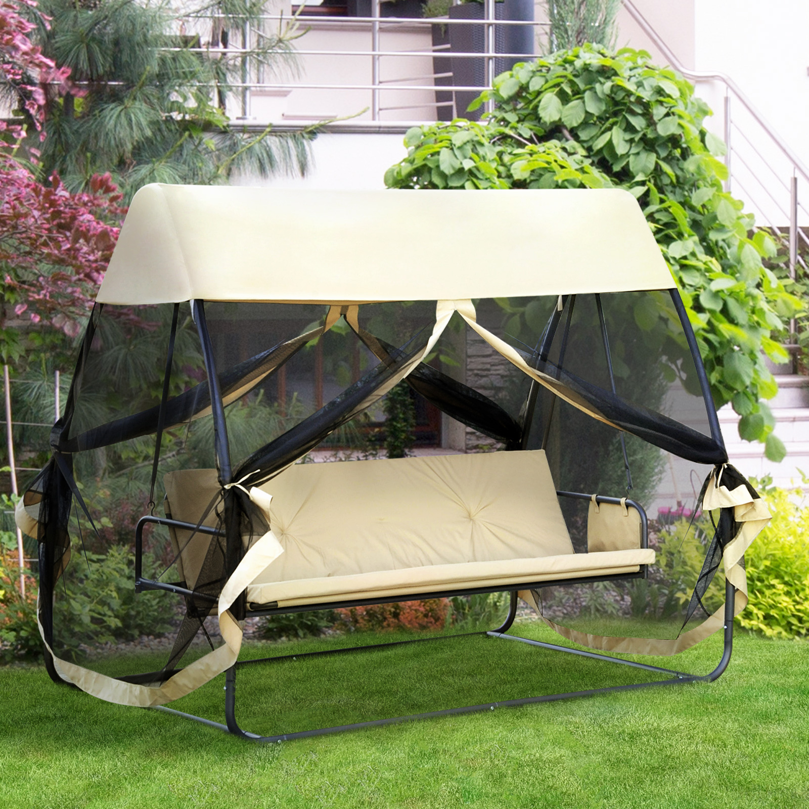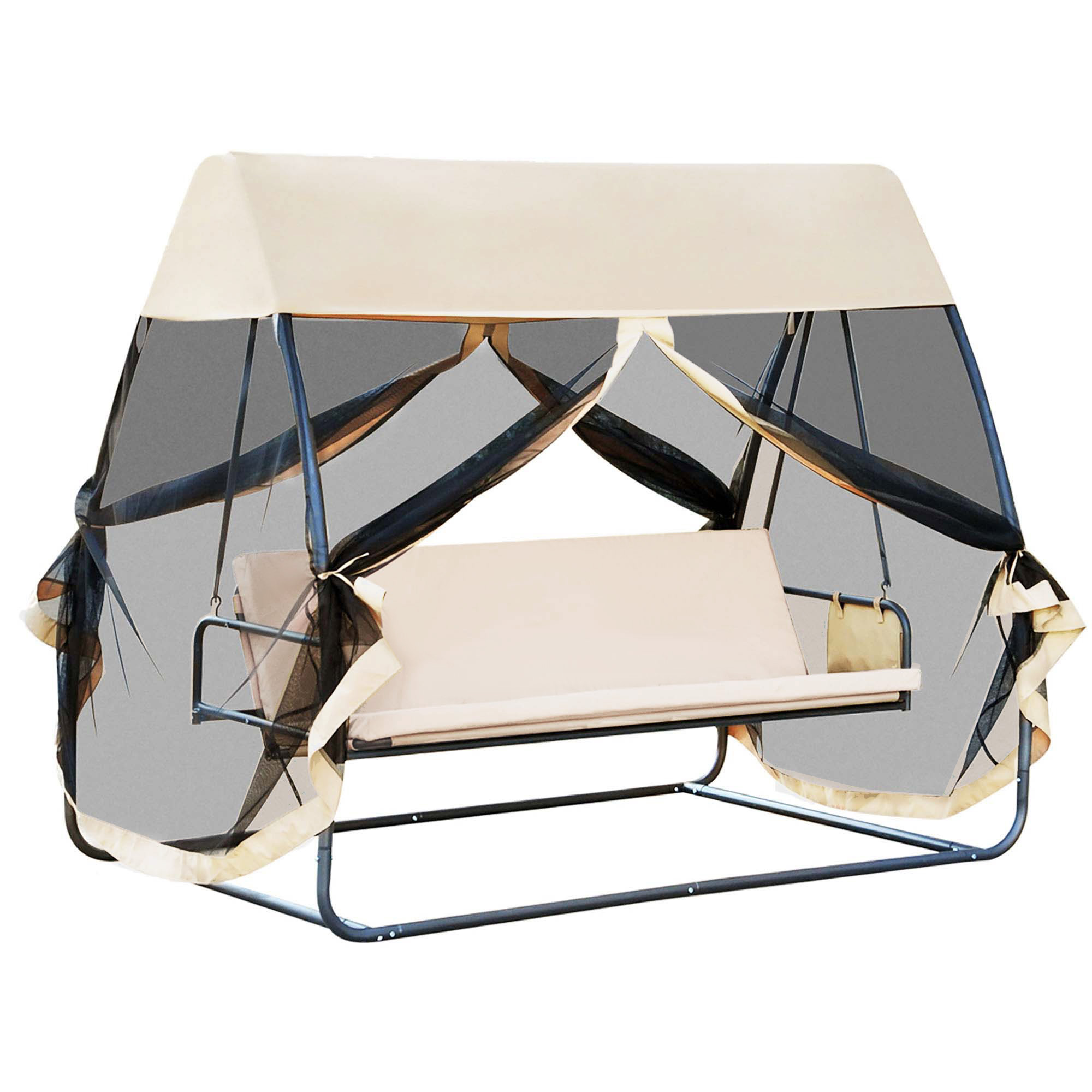 | Libellé | Balancelle de jardin convertible 3 places grand confort : matelas assise dossier, moustiquaire intégrale zippée avec toit, pochette rangement métal |