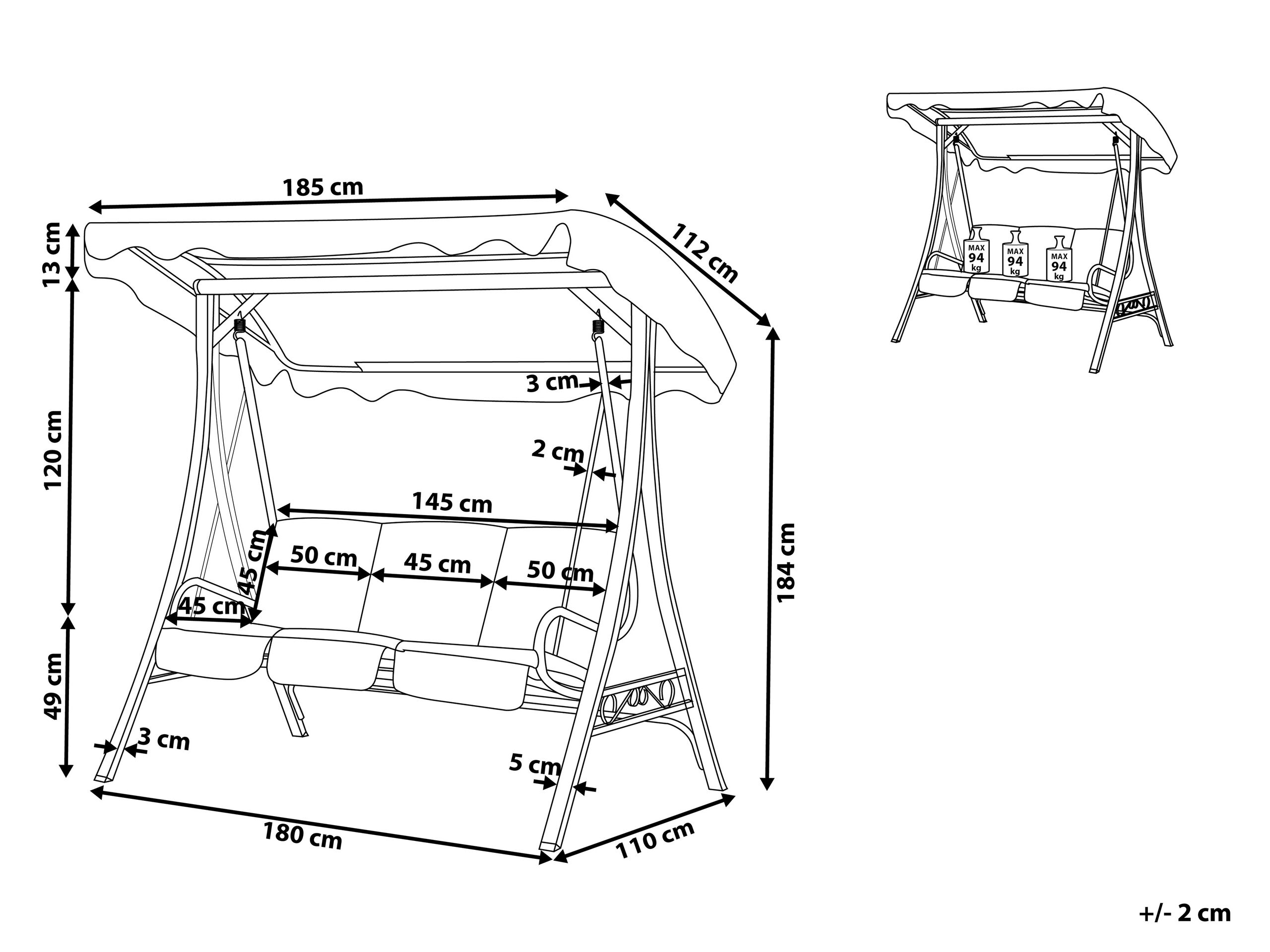 Caractéristiques clés: Hauteur du baldaquin ajustable, Assise rembourrée épaisse, Approprié pour un usage extérieur, Matières robustes faciles à entretenir, UV Résistance 5 (ISO 105-B02)