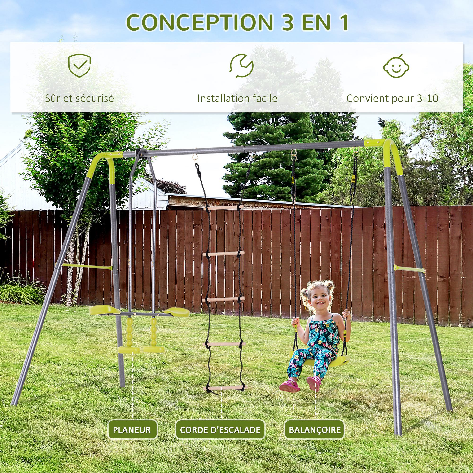 | Libellé | Balançoire 3 agrès portique avec balançoire : 2,95L x 1,38l x 1,75H m métal gris anthracite vert pomme |