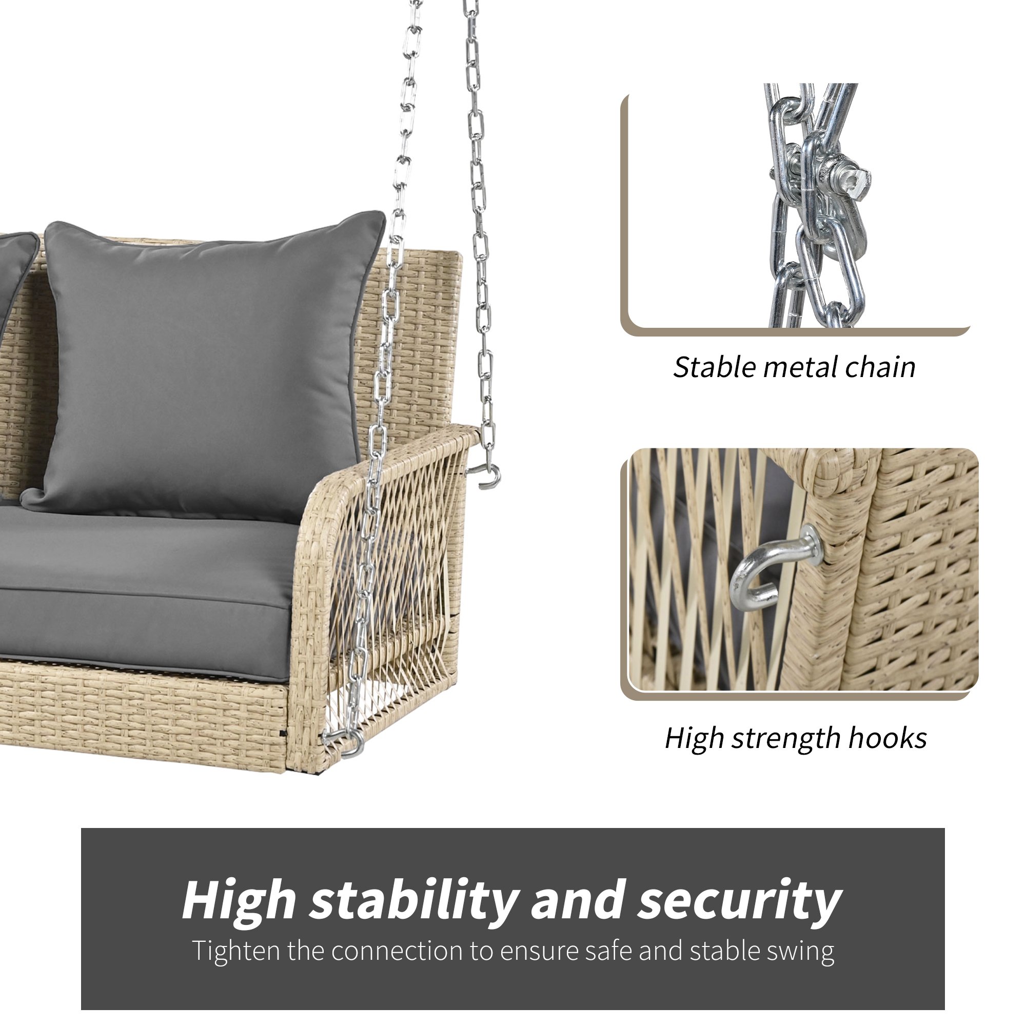 l'ensemble de la balançoire est en rotin tressé et est équipé d'un spacieux coussin d'assise double et de deux coussins de dossier, ce qui renforce l'effet global de l'ensemble.