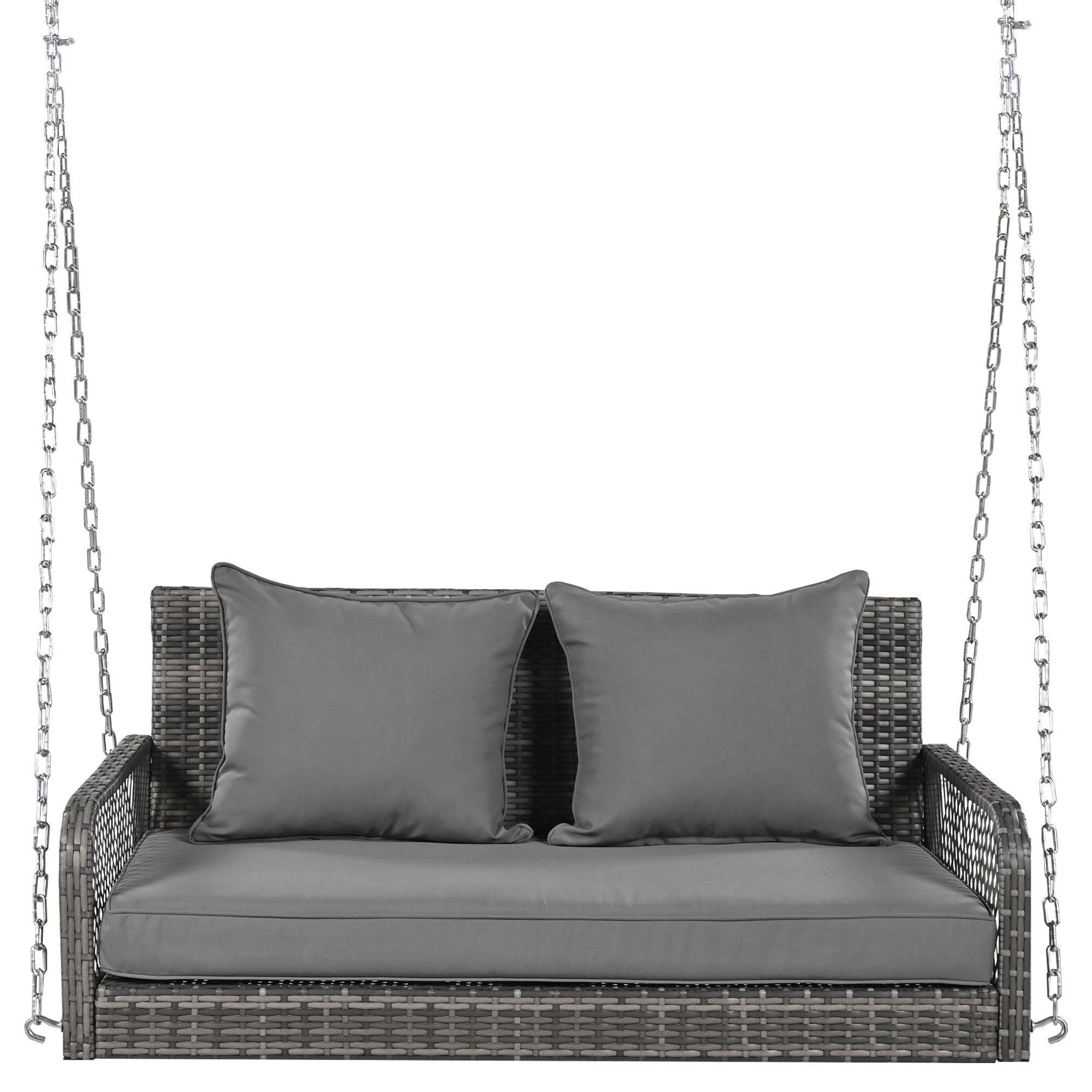 l'ensemble de la balançoire est en rotin tressé et est équipé d'un spacieux coussin d'assise double et de deux coussins de dossier, ce qui renforce l'effet global de l'ensemble.