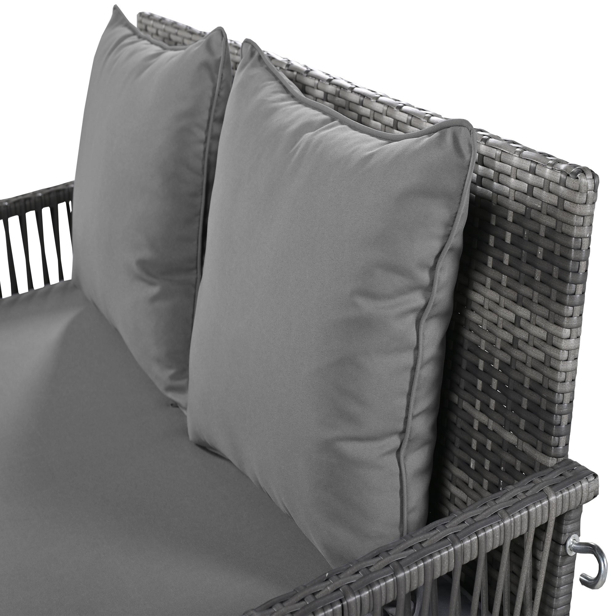 Balançoire de jardin, rotin gris, double assise avec siège et coussins, housse grise