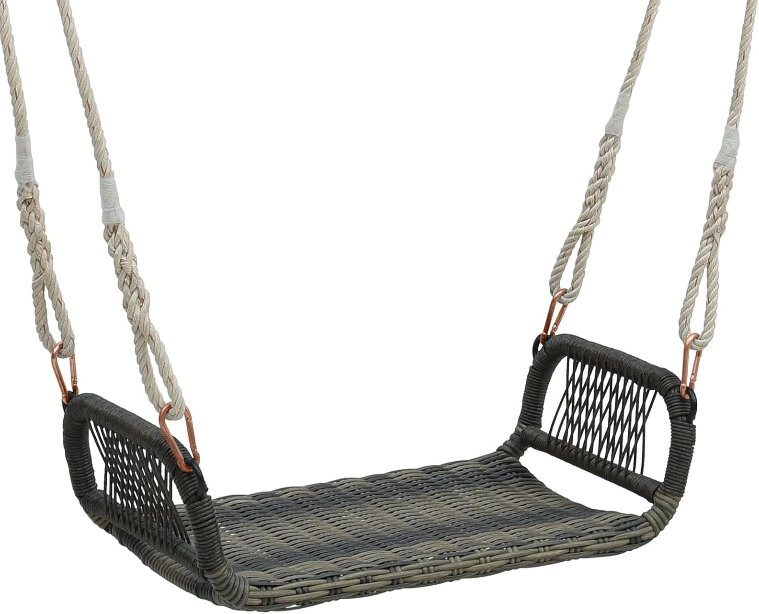 Libellé Balançoire de patio en osier tissé en rotin, sans dossier, cordes de suspension cadre en métal accoudoirs