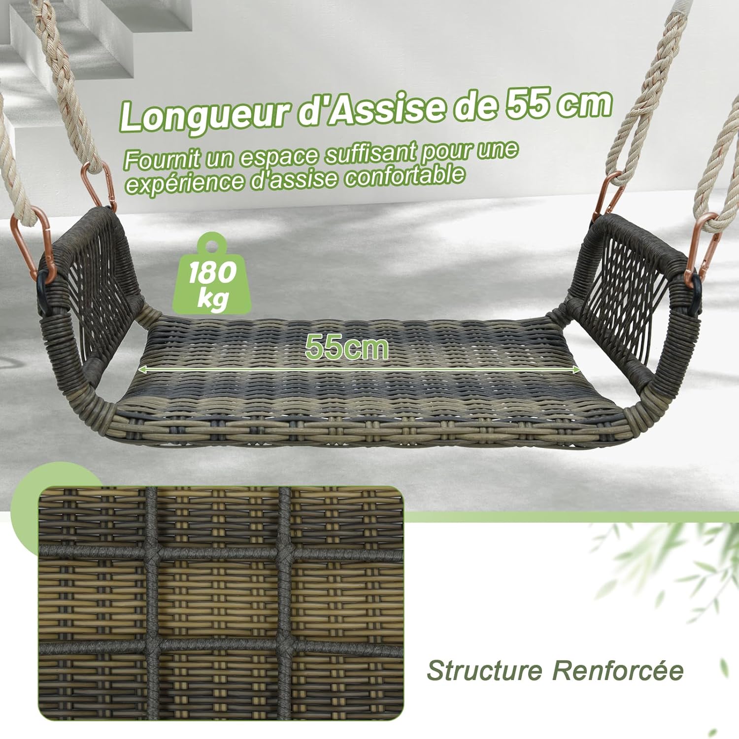• Siège Suspendu Sûr et Sécurisé - Grâce à son cadre en métal robuste et à sa construction en rotin PE de qualité supérieure, cette chaise pivotante dispose d'une capacité de poids de 180 kg. De plus, les crochets à visser et les cordes de suspension ajoutent à la stabilité et à la sécurité globales pendant votre temps libre.