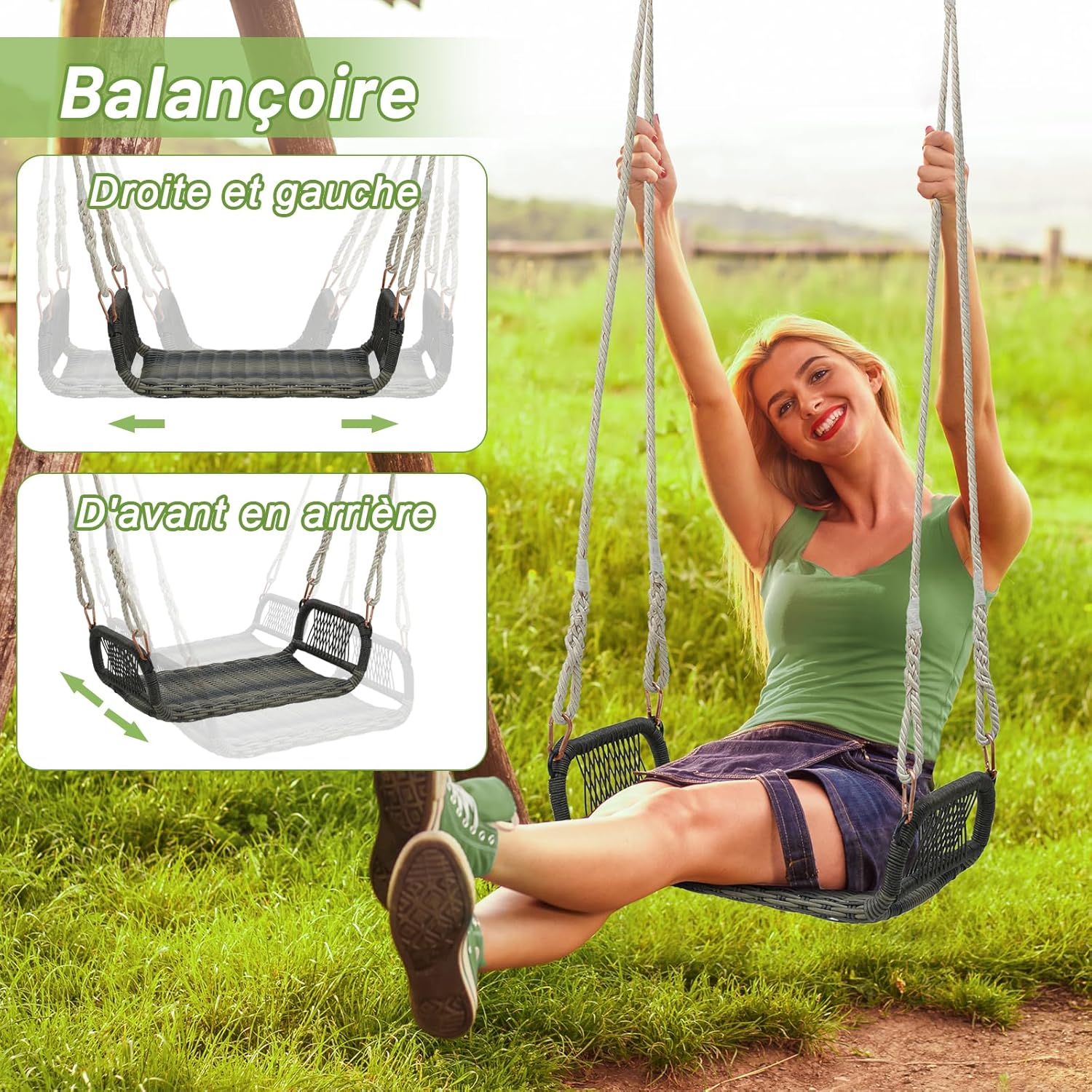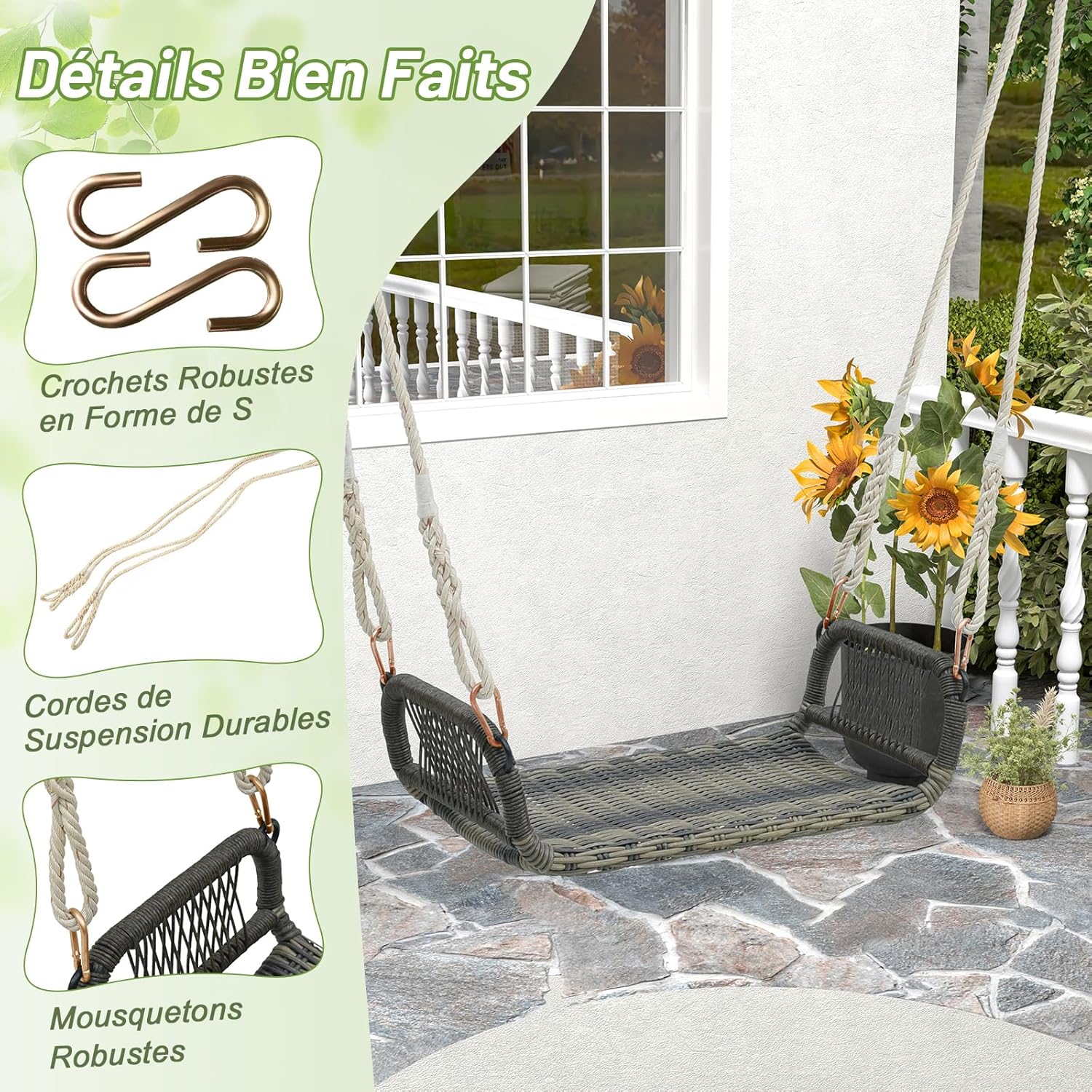 • Expérience de Glisse Améliorée - Notre balançoire est équipée de 4 cordes suspendues durables qui minimisent la friction, garantissant une expérience de bascule douce et stable. De plus, la structure coulissante bien conçue garantit que votre poids est toujours centré sur le fauteuil, offrant ainsi une stabilité maximale et évitant les accidents.