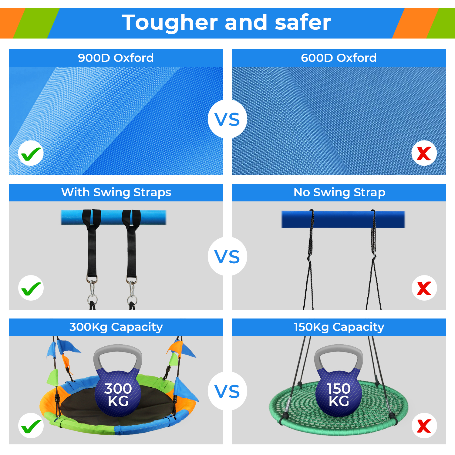 【Balançoire pour tous les âges】 La balançoire nid est fabriquée en tissu Oxford 900D, qui a une densité de fibres plus élevée, plus épaisse et durable. Les sangles pivotantes et le mousqueton améliorent la capacité de charge de la corde. Cela contribue à une forte balançoire de nid portante, portant 300 kg. Elle peut accueillir 2 adultes ou 4 enfants, et adaptée à tous les âges, chacun peut y trouver sa place.