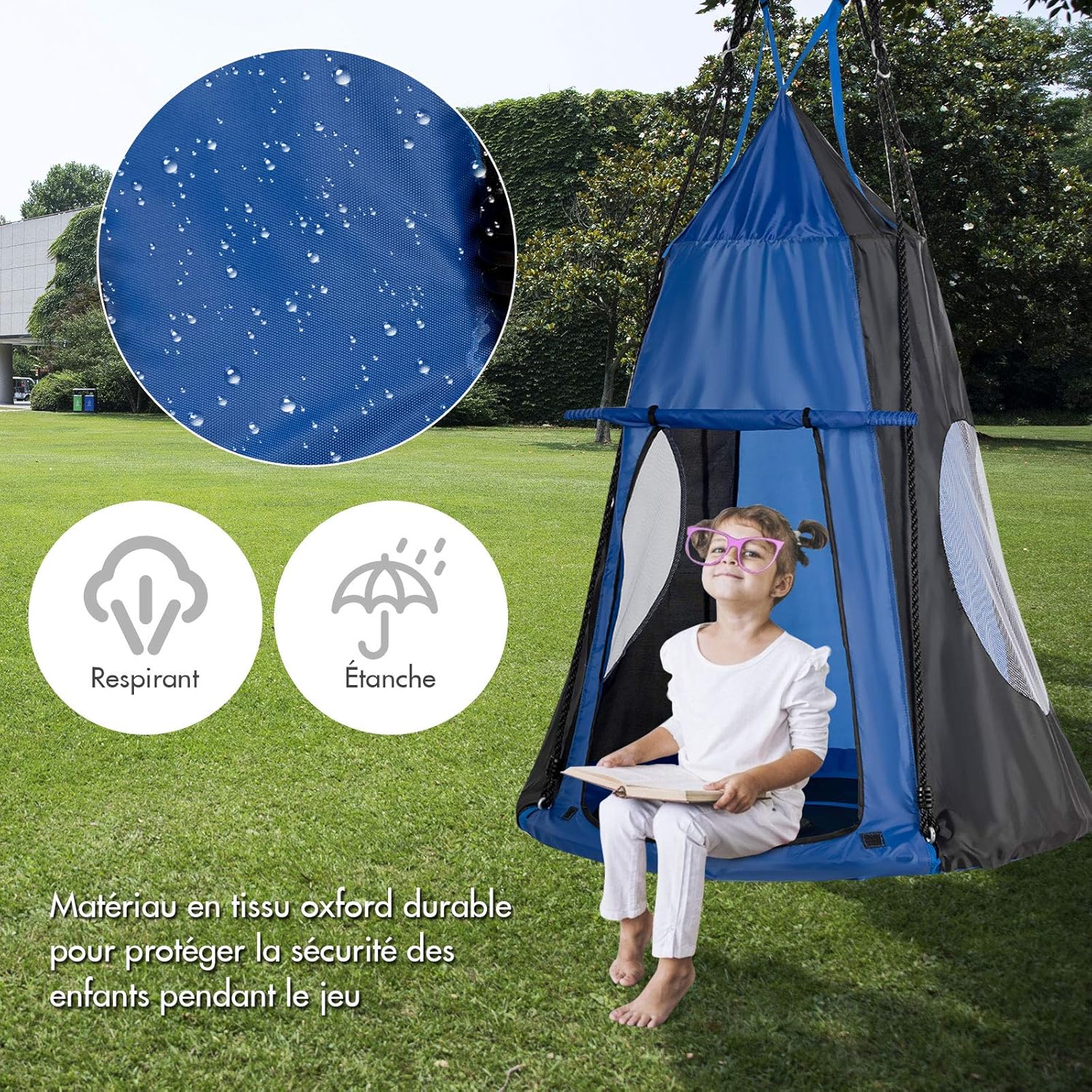 Balançoire nid d’oiseau avec tente amovible et corde réglable en hauteur charge 150 kg bleu avec tente