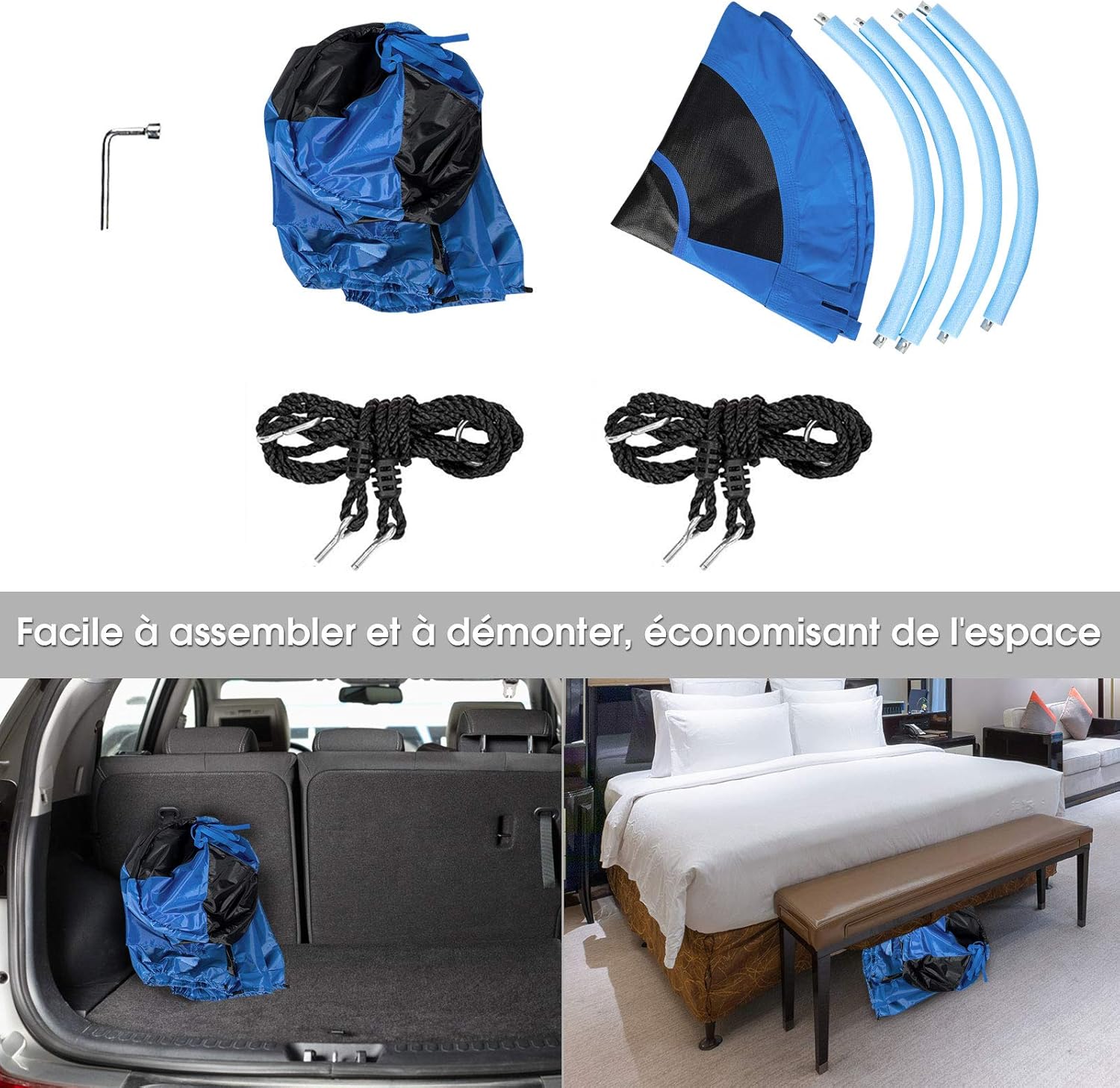 - Cadre solide et stable : Avec des cordes épaisses et robustes, les 4 tubes en acier peremettent de se suspendre facilement. Sur les cordes vous trouverez des anneaux de support pour renforcer la stabilité et la durabilité. Il procure une capacité de charge allant jusqu’à 150kg pour que plusieurs enfants/animaux de compagnie/membres de famille peuvent s’asseoir ensemble avec un large diamètre de 100cm.