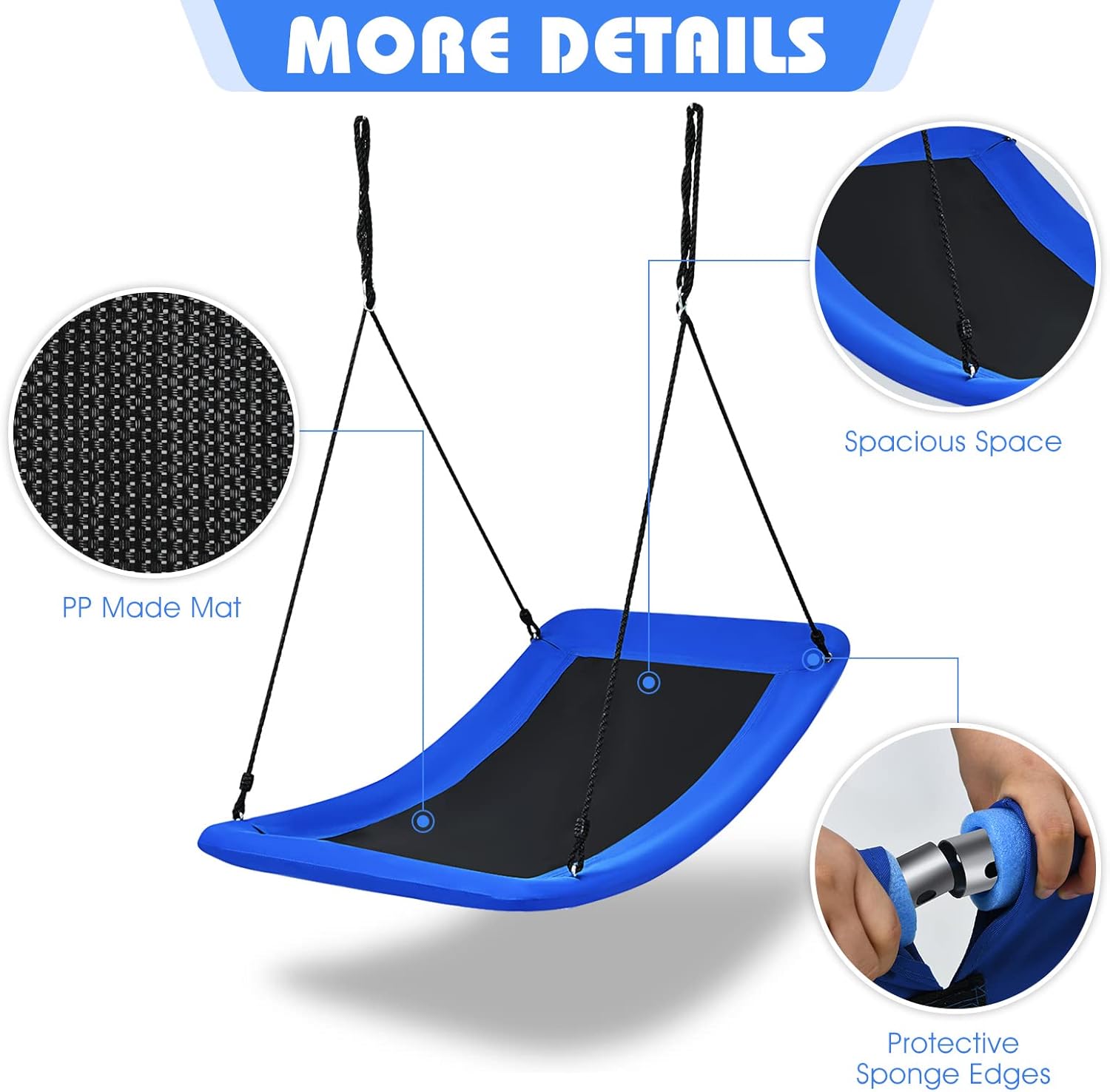 - Conception Sûre : Le bord de la balançoire est recouvert d'une éponge, ce qui peut assurer la sécurité d'utilisation des enfants. Et la connexion de couture de la balançoire est serrée et ferme, ce qui peut également améliorer la sécurité de la balançoire pendant son utilisation.