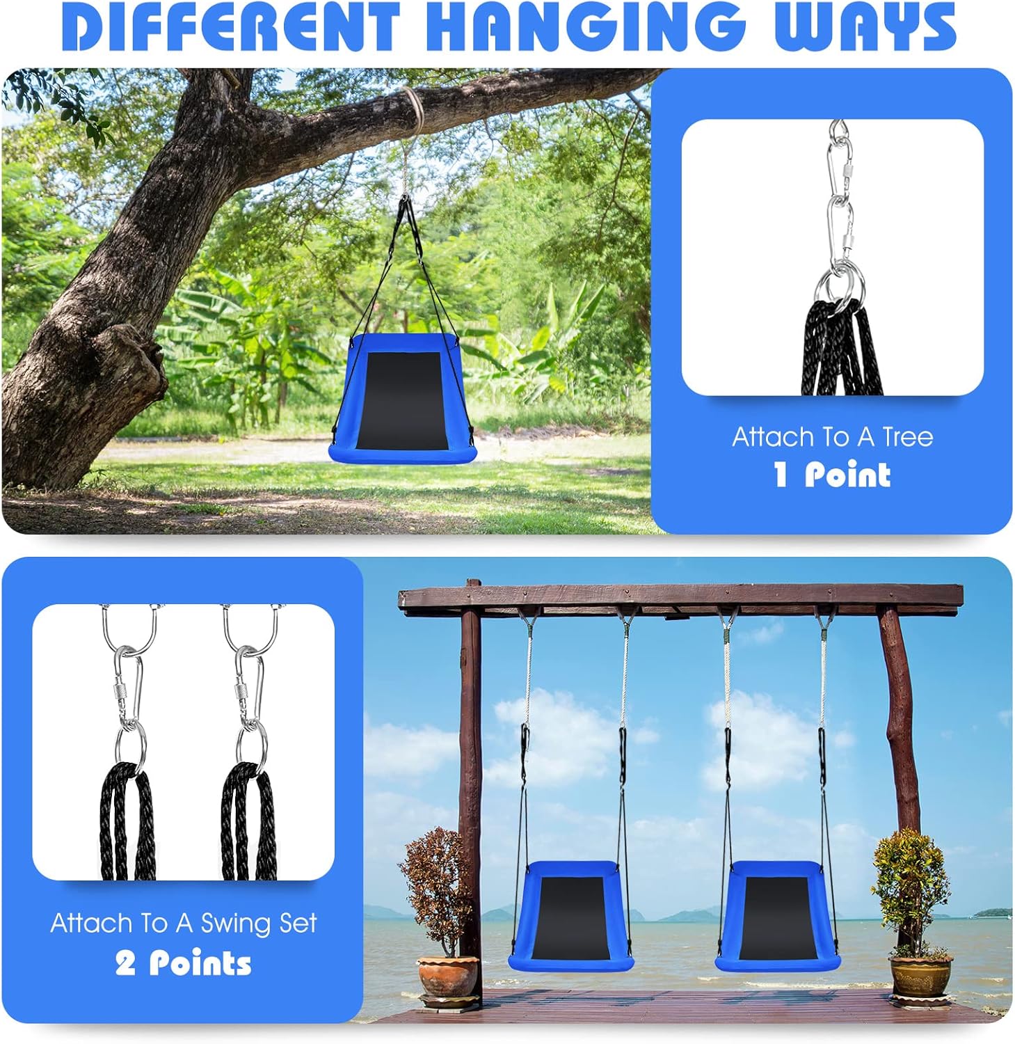 - Utilisations Larges : Nos balançoires sont incurvées, ce qui ajoute au plaisir des enfants. Et la balançoire est suffisamment spacieuse pour être utilisée comme hamac et peut accueillir 2 à 3 enfants en même temps. Vous pouvez utiliser la balançoire dans le jardin, balcon, parc.