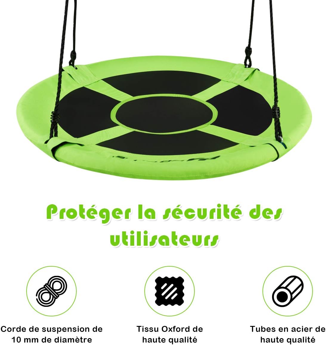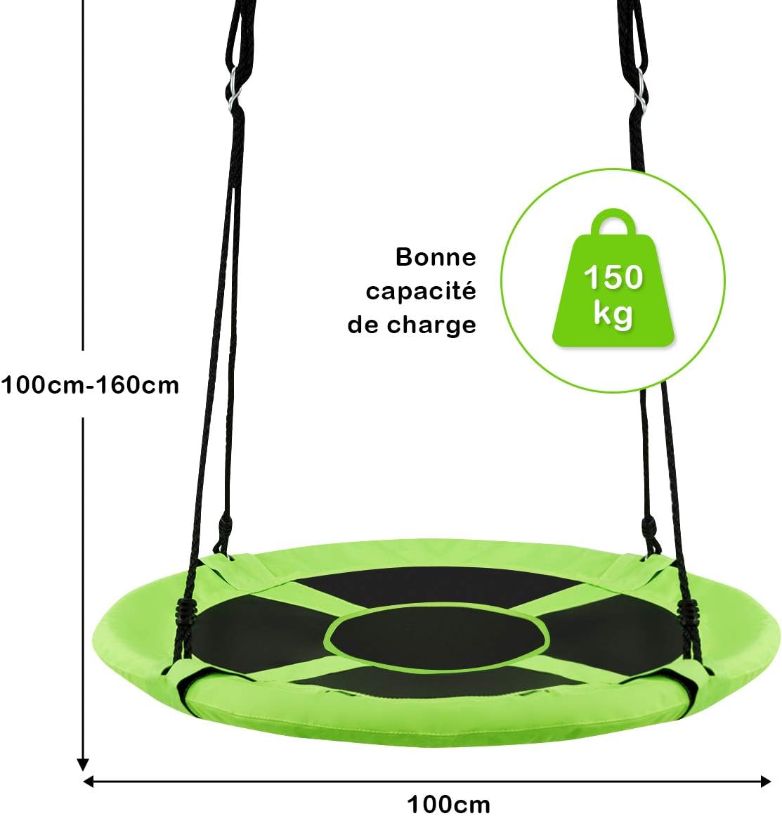 - Fonction puissant et hauteur réglable : Notre balançoire nid d’oiseau sera un jouet utile pour vos enfants. Elle peut améliorer l’équilibre, la capacité de coordination physique de vos enfants. D’ailleurs, la hauteur peut être réglée de 100 cm à 160cm en ajustant les pièces métalliques.
