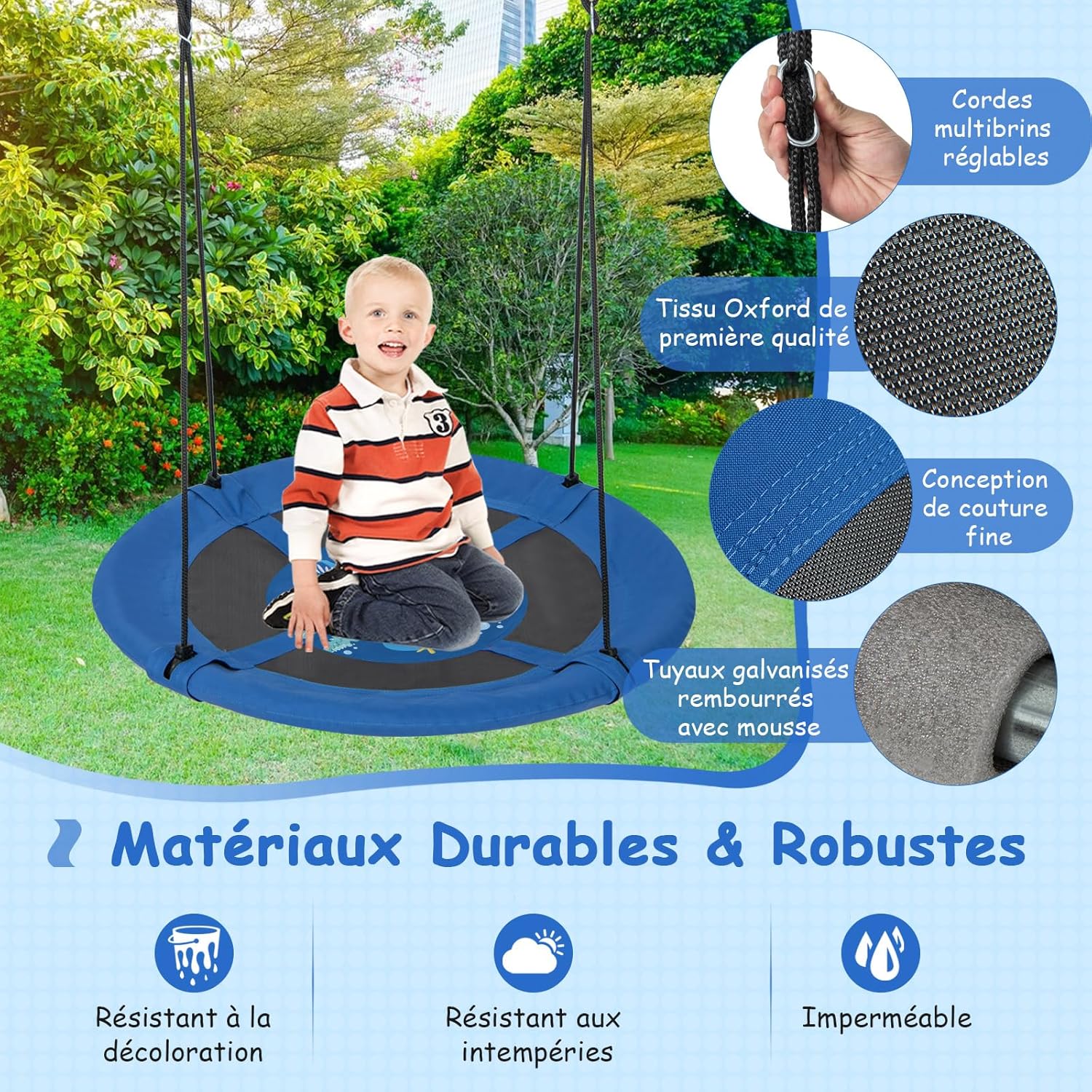 Notre balançoire nid d’oiseau sera un jouet très amusant pour vos enfants. Capable de supporter un poids jusqu’à 150kg et d’un diamètre 102cm, elle permet à plusieurs enfants de s’y amuser ainsi que les adultes et les animaux de compagnie. La matière de tissu oxford et de tissu en PP élastique et respirant rend le siège plus confortable et n’est pas facile à déchirer. Deux cordes avec deux anneaux vous aident à l’accrocher partout, non seulement idéal à l’intérieur comme salon, chambre mais également à l’extérieur!