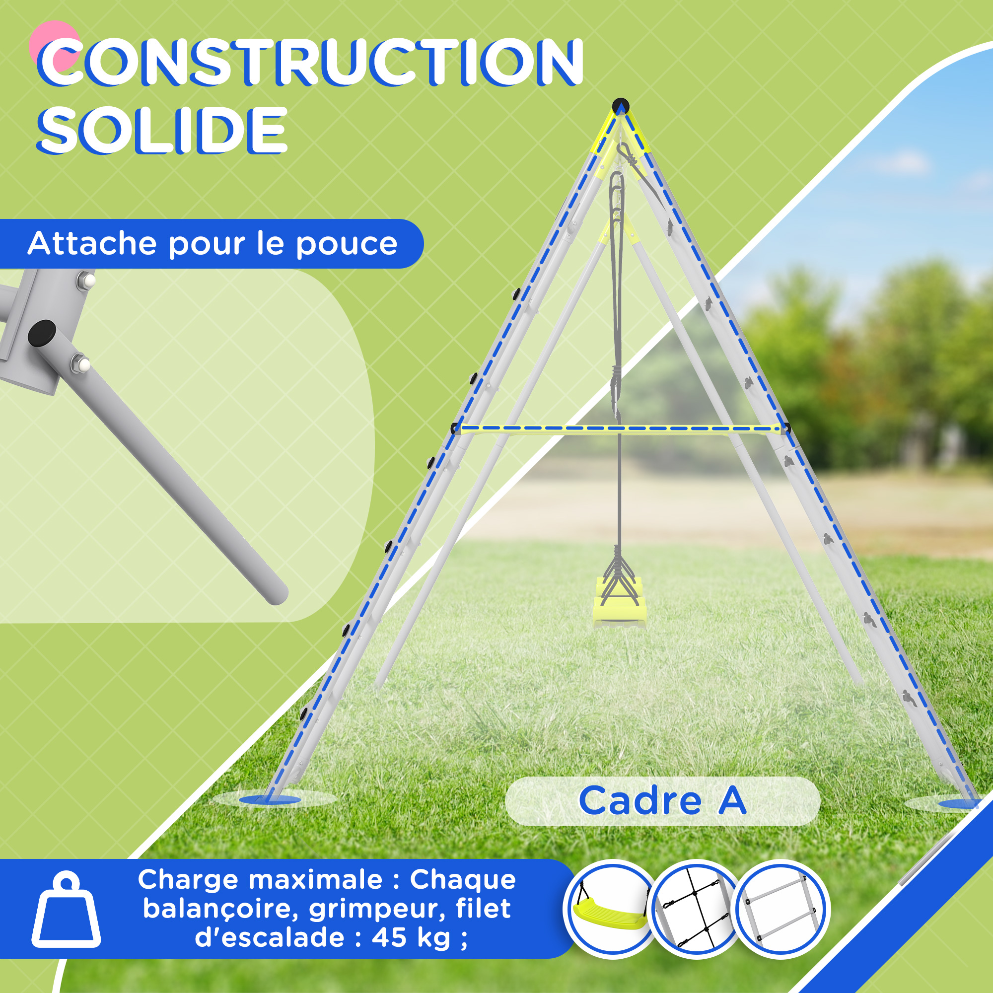 - Fabrication du châssis en métal époxy anticorrosion robuste, balançoire en plastique solide moulé par injection, cordages en synthétique imputrescible