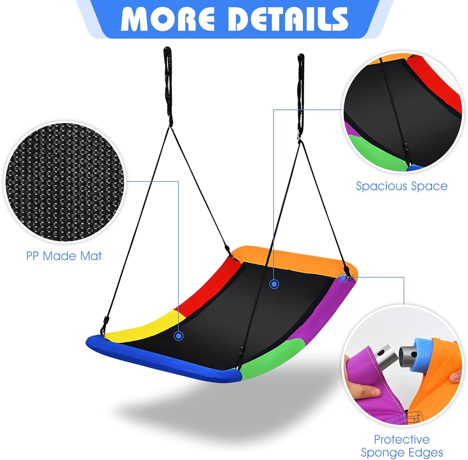 - Conception Sûre : Le bord de la balançoire est recouvert d'une éponge, ce qui peut assurer la sécurité d'utilisation des enfants. Et la connexion de couture de la balançoire est serrée et ferme, ce qui peut également améliorer la sécurité de la balançoire pendant son utilisation.