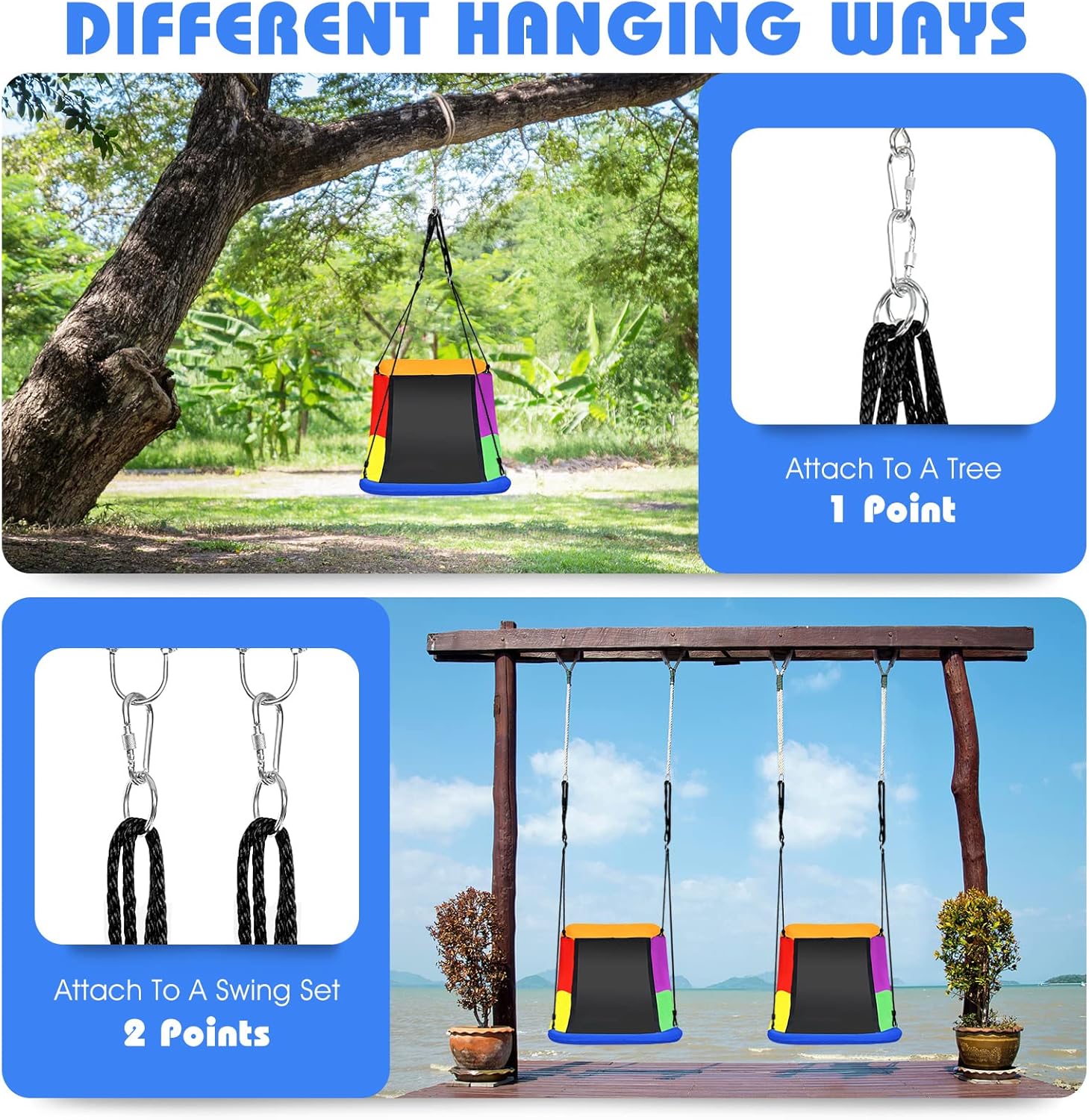 - Utilisations Larges : Nos balançoires sont incurvées, ce qui ajoute au plaisir des enfants. Et la balançoire est suffisamment spacieuse pour être utilisée comme hamac et peut accueillir 2 à 3 enfants en même temps. Vous pouvez utiliser la balançoire dans le jardin, balcon, parc.