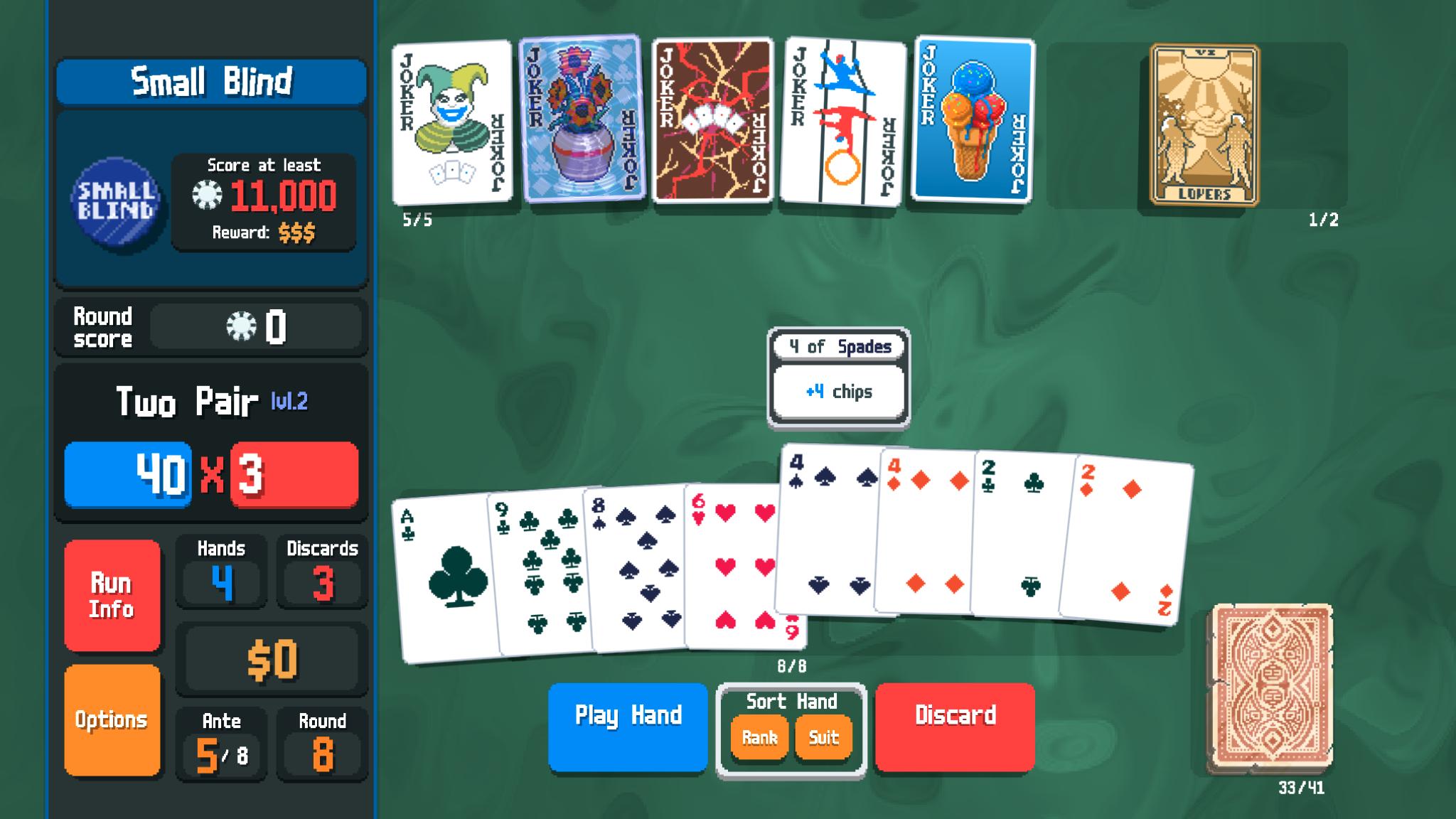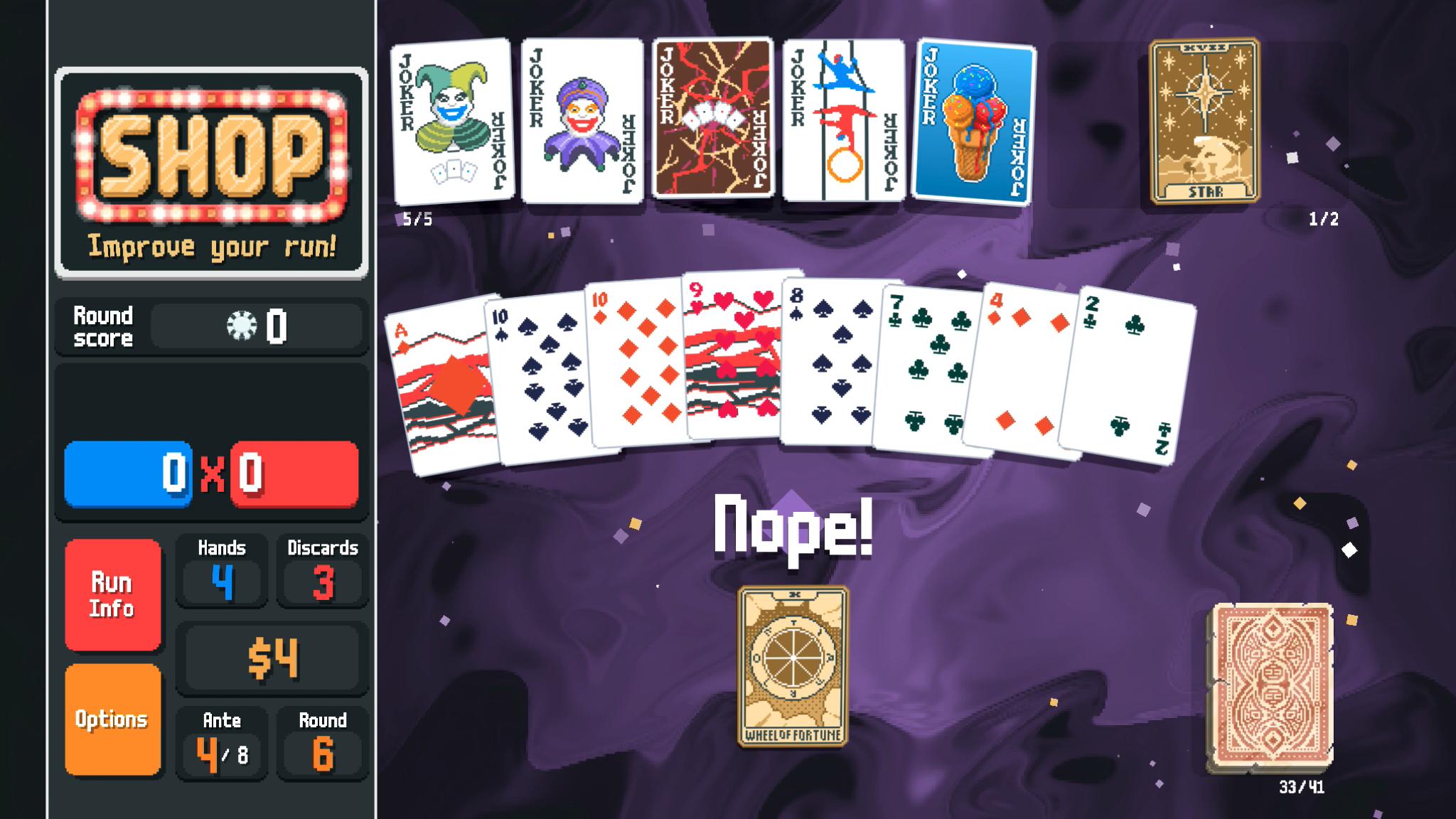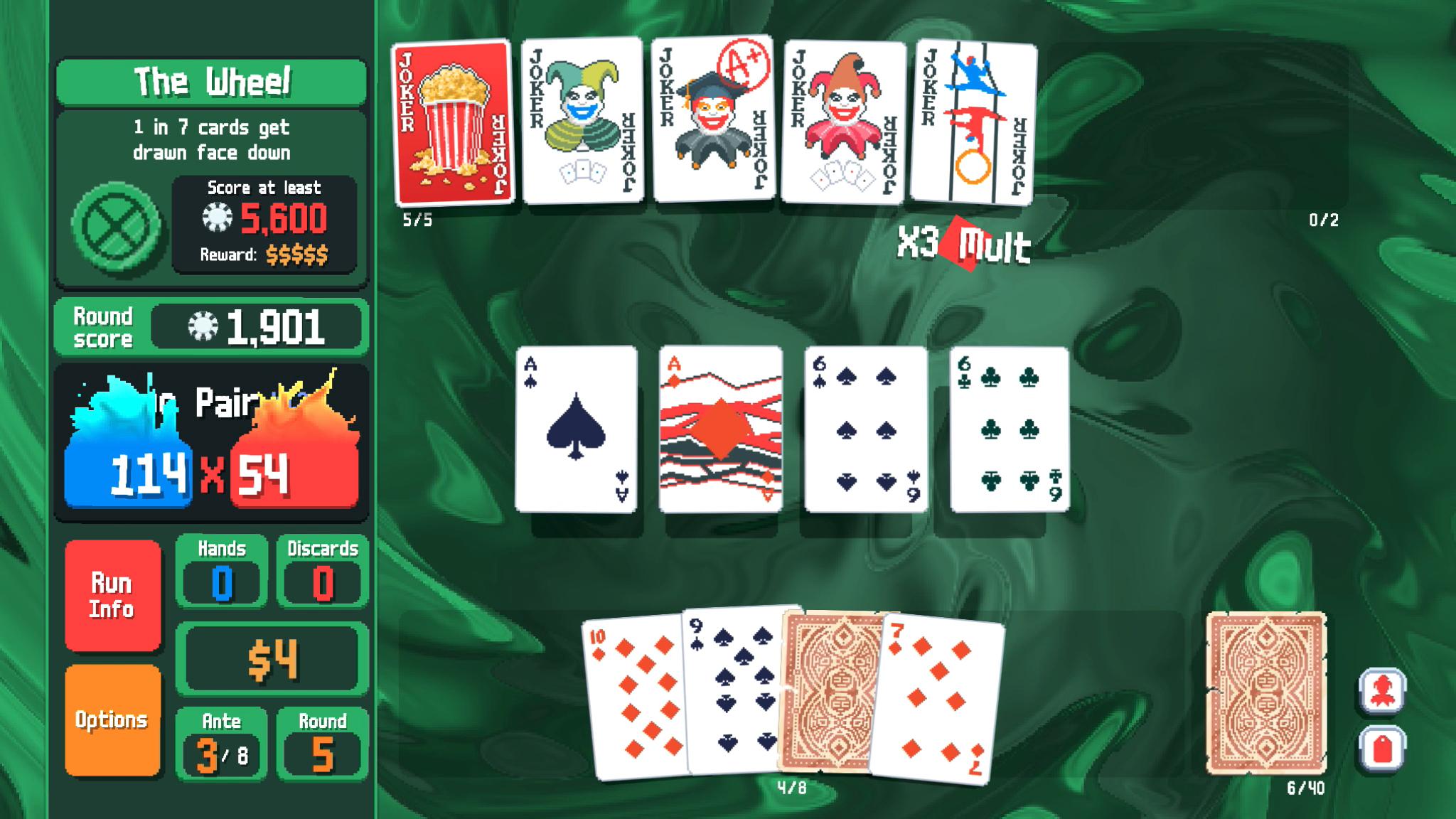 Balatro est un jeu de deckbuilding roguelike basé sur du poker qui met en avant les puissantes synergies pour gagner gros. Un jeu de poker roguelike. Balatro est un jeu de deckbuilding prenant où vous jouez des combinaisons de poker illégales, découvrez des jokers révolutionnaires et déclenchez des combos aussi palpitants que dévastateurs. Des possibilités sans fin Combinez des mains de poker avec des jokers uniques pour créer une variété de synergies et de decks. Gagnez assez de jetons pour venir à bout des mises, tout en découvrant des bonus de main et des decks secrets. Il vous faudra tous les avantages possibles pour atteindre l'ultime blind, venir à bout du dernier ante et remporter la victoire. L'expérience de poker roguelike ultime. Des possibilités sans fin : chaque bonus, défausse et joker peut grandement altérer le déroulement de votre partie. Un mode campagne exhaustif avec 5 difficultés, ainsi qu'un mode difficile, un mode quotidien et un mode classé.