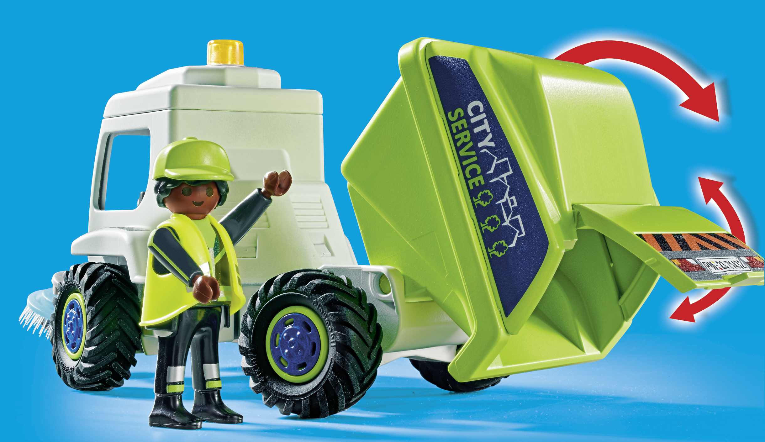 Les rues de la ville sont sales ? Pas de problèmes, le camion balayeuse arrive ! Avec ses brosses rotatives, aucune saleté ne lui résiste. Quand le véhicule se déplace et que les brosses sont abaissées elles se mettent à tourner toutes seules ! La benne à l’arrière du véhicule s’ouvre et peut être inclinée. Le toit de la cabine peut s’enlever pour faciliter la jouabilité. Le coffret comprend un personnage et un camion équipé de brosses à rotation automatique et d’une benne inclinable.