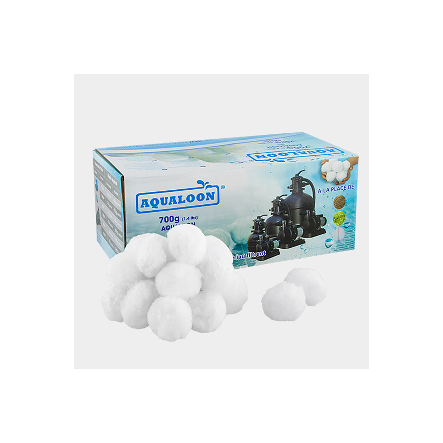 Balles filtrantes aqualoon uniquement pour filtres à sable équipés d'un diffuseur 4m³/h. plus avantageuse et beaucoup plus légère que les médias filtrants existants, aqualoon est la nouvelle façon de purifier l'eau. elle se différencie de tous autres médias filtrants grâce à sa finesse de filtration exclusive d'un micron (1µ), là où le sable quartz 40µ, la cartouche 25µ, le diatomée, le verre recyclé = 5µ qui laissent des petites impuretés apparentes. aqualoon se présente sous forme de petites boules fabriquées de 100 % polyéthylène, dans un filet de brins entrelacés, afin d'éviter que les boules s'effilochent pendant leurs utilisations. en même temps ce procédé étend leur durée de vie et l'efficacité. aqualoon = 100 % recyclable donc écologique. quantité requise : - pour un filtre à sable de 4m³/h - 1 carton de 700g est nécessaire. avantages : - économie d'énergie - capacité élevée de saleté - Évite du sable dans la piscine - très faible augmentation de pression - aucun durcissement - excellent résultat en filtration - fréquence réduite de contre-lavage - longévité extrême - recyclable, non toxique - extra légère pour manutention aisée test de comparaison 700 gr aqualoon = 25 kg de sable quartz installation l'utilisation d'aqualoon dans un kit de filtration est similaire à l'utilisation traditionnelle du sable. 1) enlever le couvercle du réservoir 2) vider le réservoir de tout résidu et nettoyer le entièrement 3) remplir le réservoir avec aqualoon 4) remettre le couvercle 5) démarrer la pompe de filtration