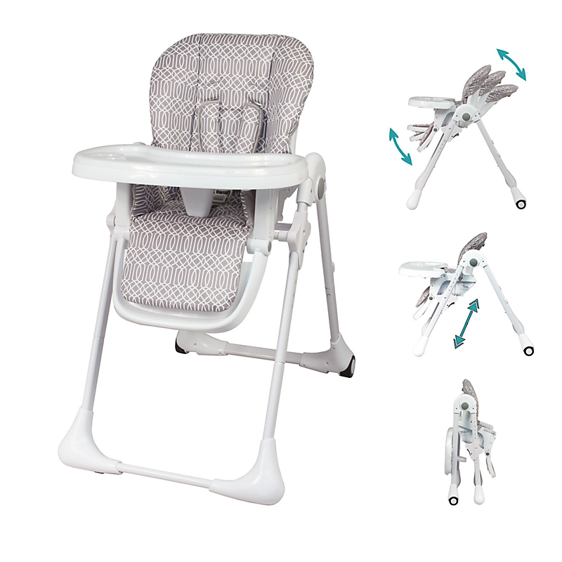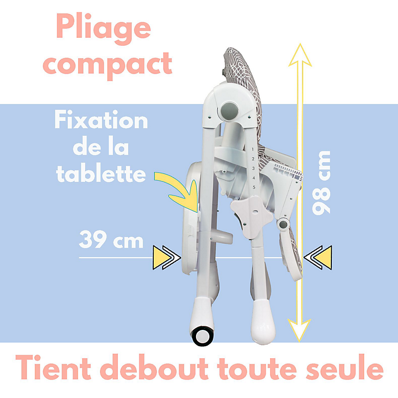 - Hauteur d'assise réglable: 7 positions permettant de placer la chaise contre une table après avoir retiré la tablette