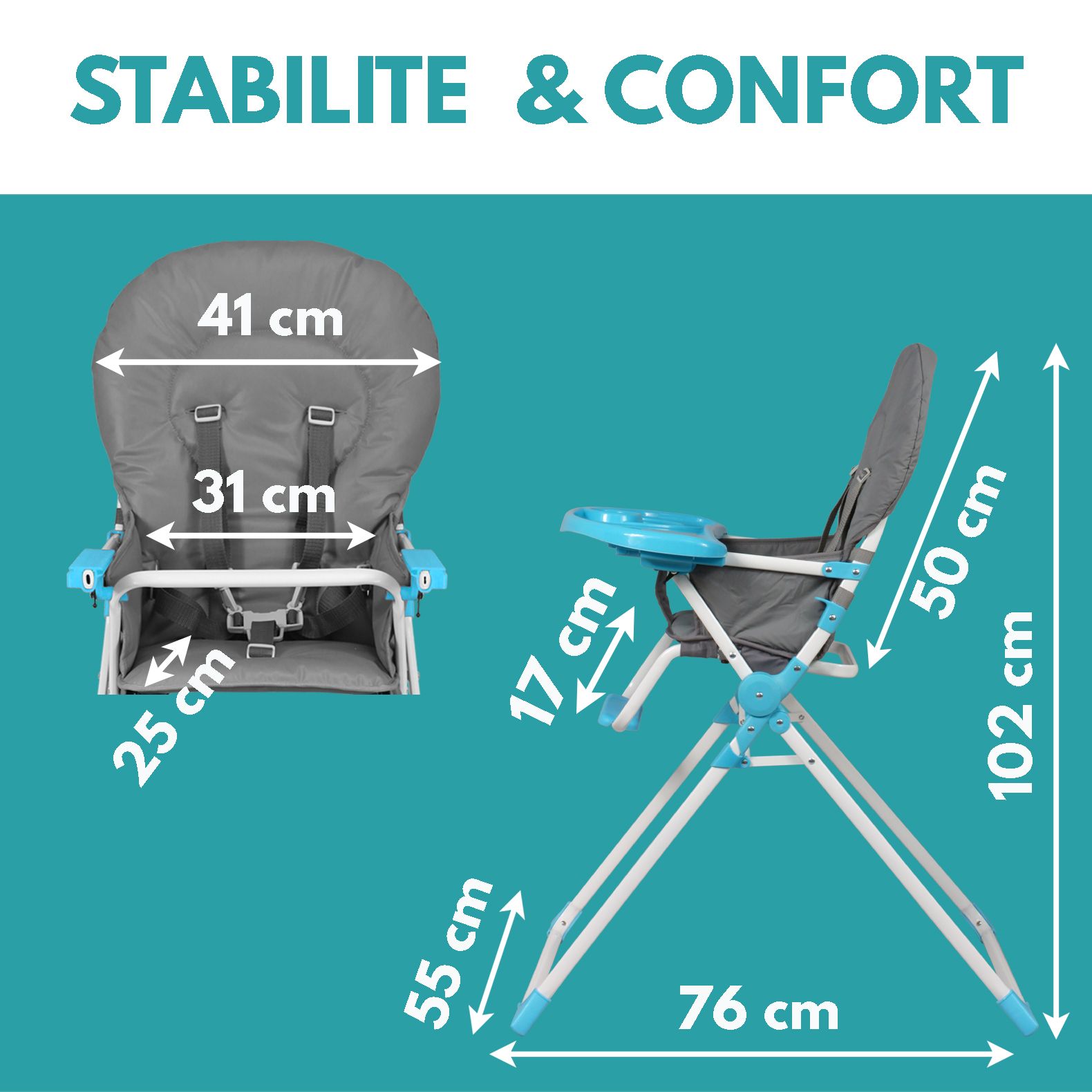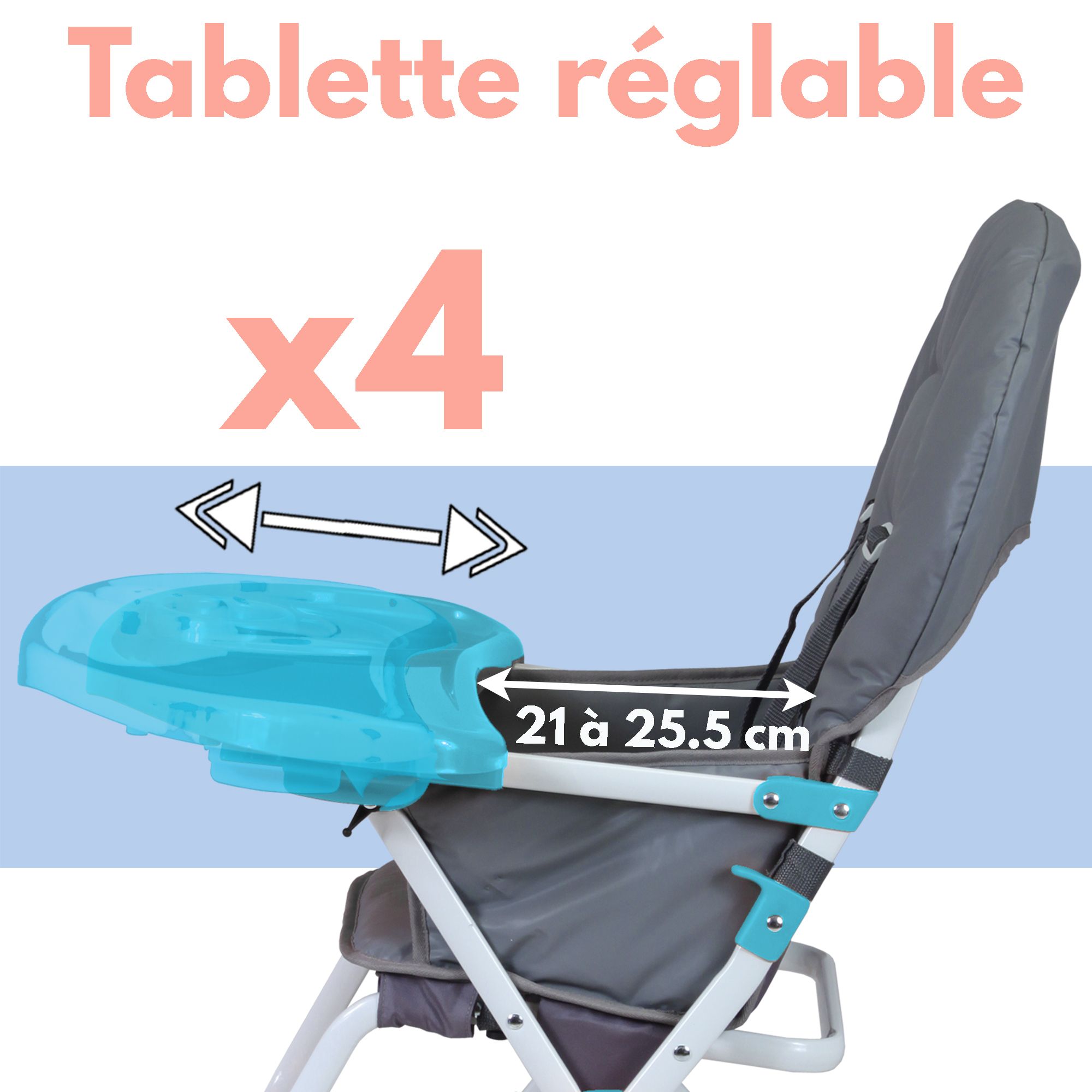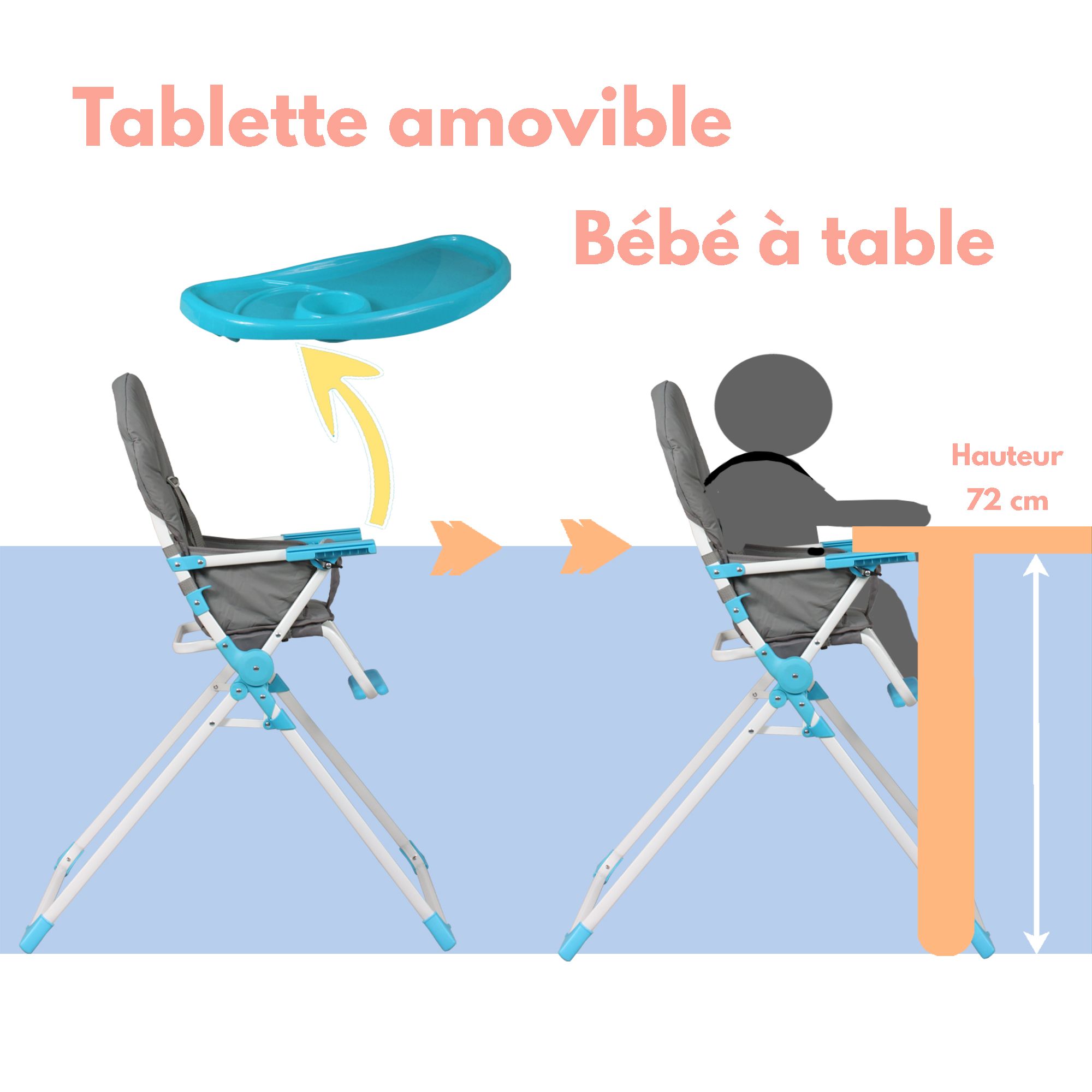 - Tablette amovible pour mettre bébé à table avec les grands, et réglable en profondeur pour s'adapter à l'âge du bébé