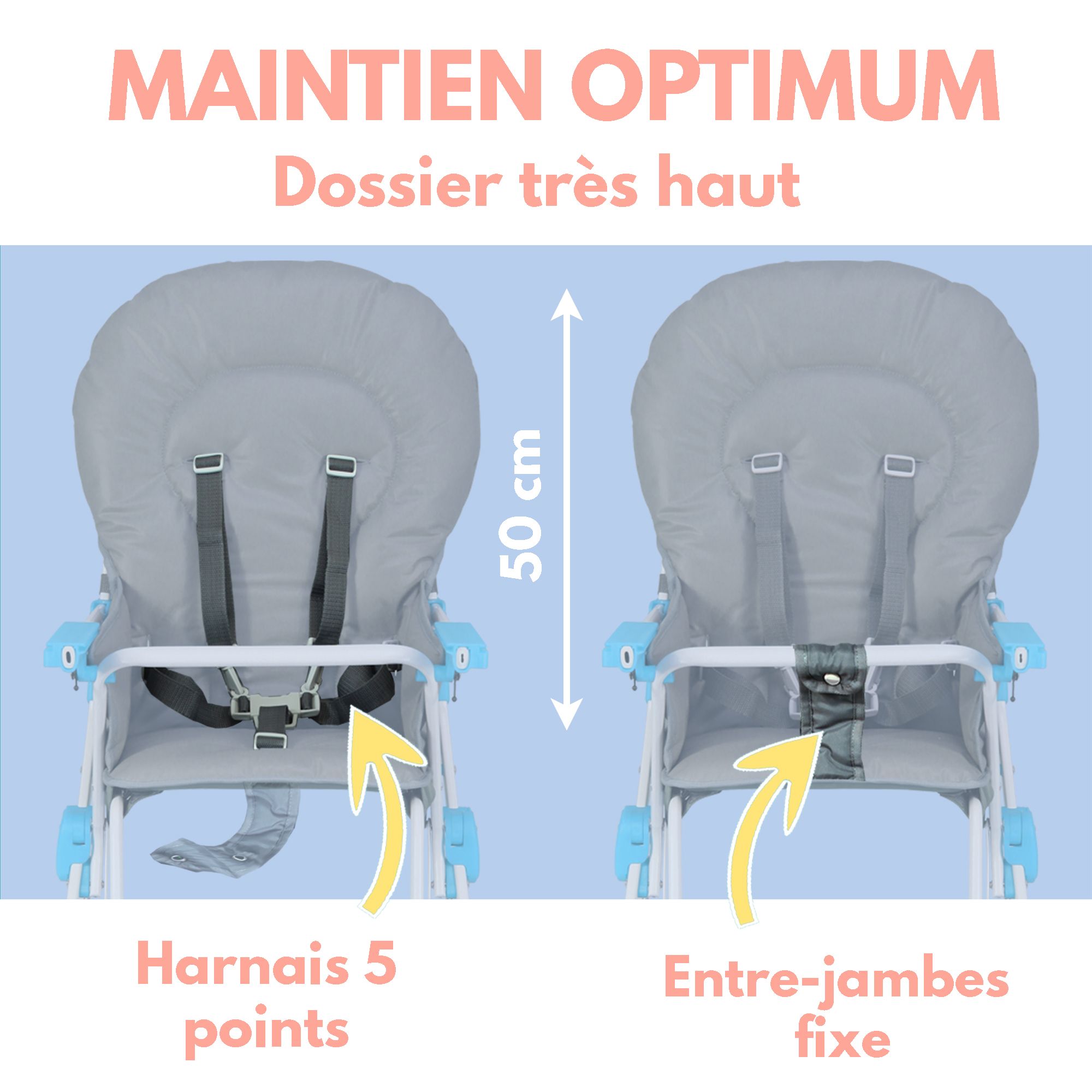 - Harnais 5 points, entre-jambes fixe et grande hauteur de dossier pour un maintien optimum du bébé dans son siège