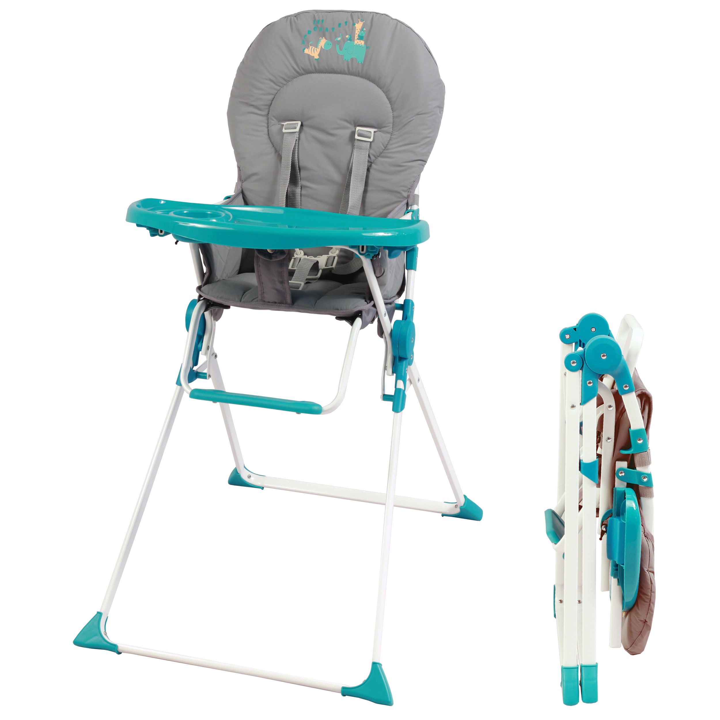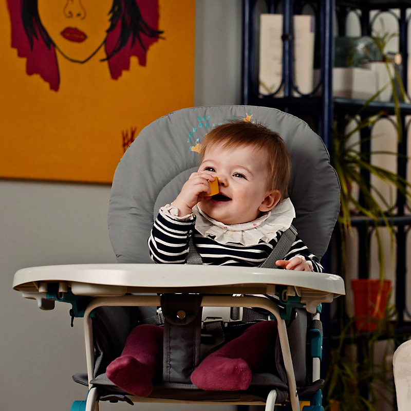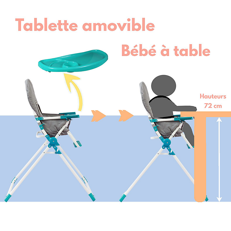 - Tablette amovible pour mettre bébé à table avec les grands, et réglable en profondeur pour s'adapter à l'âge du bébé