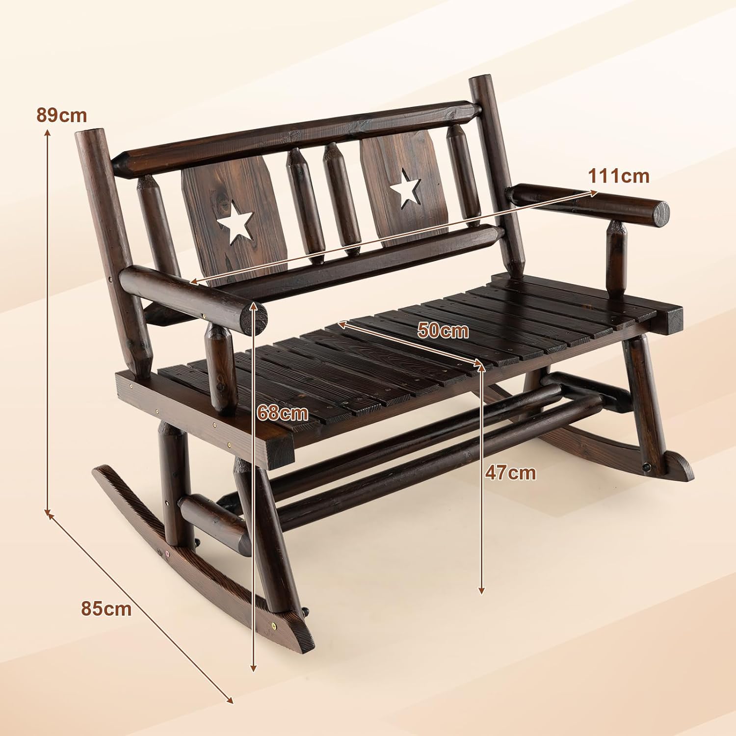 Conçu pour 2 personnes, ce fauteuil à bascule double vous permet, ainsi qu'à un être cher, de partager des moments de pure détente, se balançant doucement avec un système de bascule de pointe qui transforme chaque balancement en une glissade sans effort vers la tranquillité. Alors que vous vous installez dans le siège large et ergonomiquement courbé, laissez l'esthétique terreuse et la structure robuste du banc à bascule vous transporter dans un monde où le temps ralentit et où les rêves de ferme s'épanouissent. Ne vous inquiétez pas de la stabilité. La construction solide en bois de sapin et de pin peut supporter jusqu'à 320 kg. De plus, le traitement de carbonisation résiste aux éléments et à l'épreuve du temps.